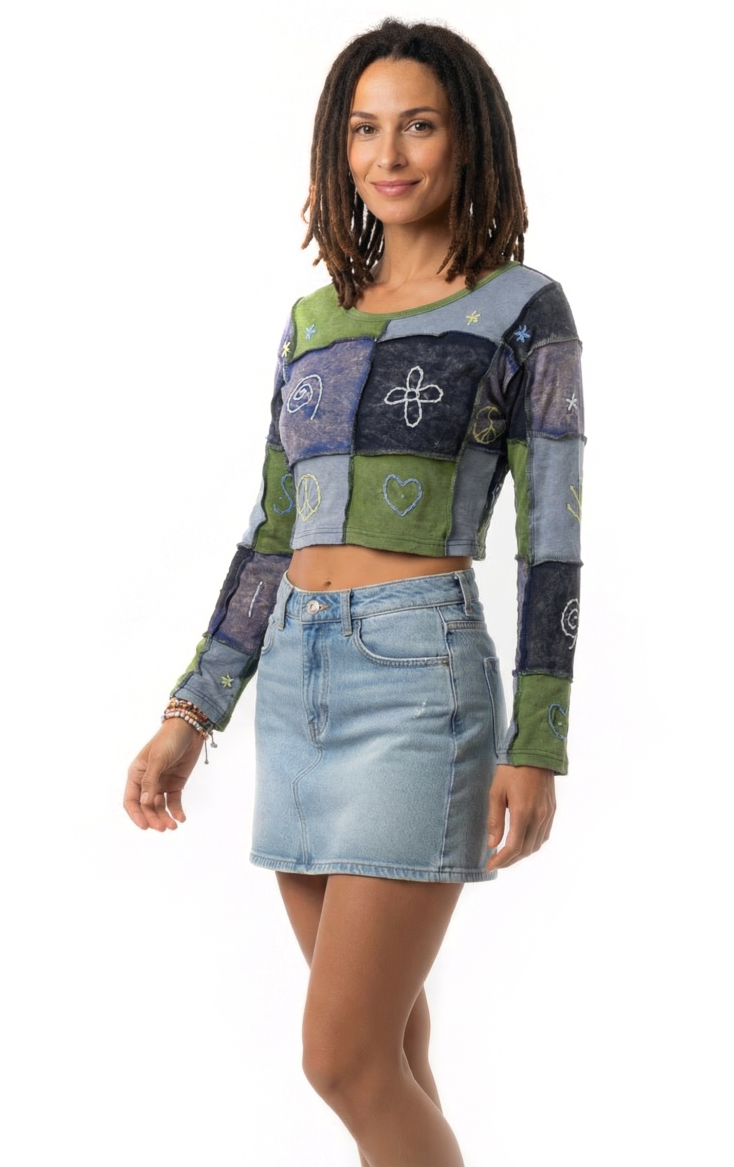 Przód bluzy zdobią charakterystyczne nepalskie nacięcia w kolorowych pasmach, które nie tylko pełnią funkcję dekoracyjną, ale także podkreślają oryginalny, etniczny styl tego ubrania. Dodatkowym elementem są ręcznie haftowane wzory oraz naszyte, wielobarwne kwiatuszki, które nadają bluzie delikatności i artystycznego ducha. Każdy detal został wykonany ręcznie, co czyni każdą bluzę niepowtarzalnym egzemplarzem.