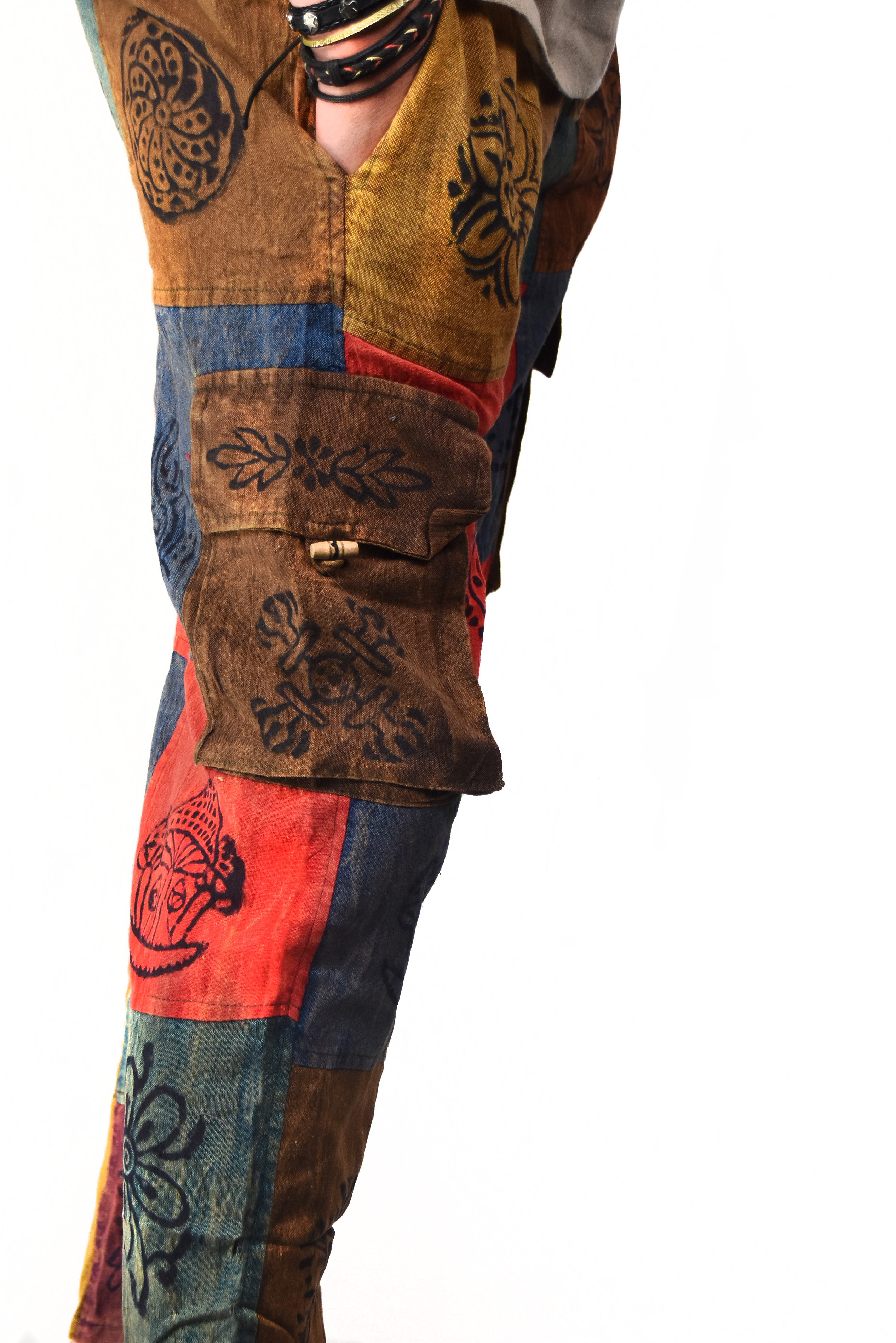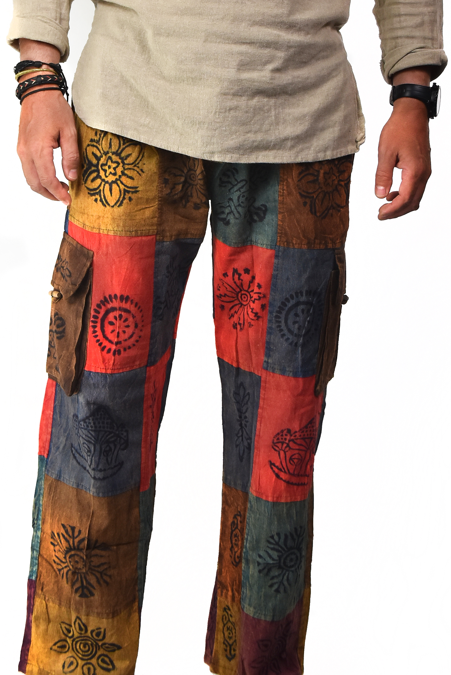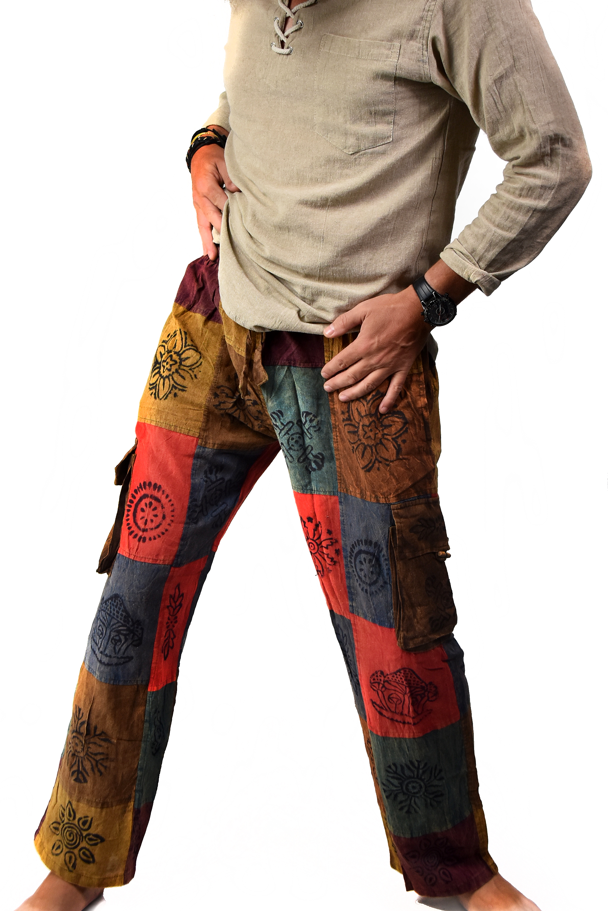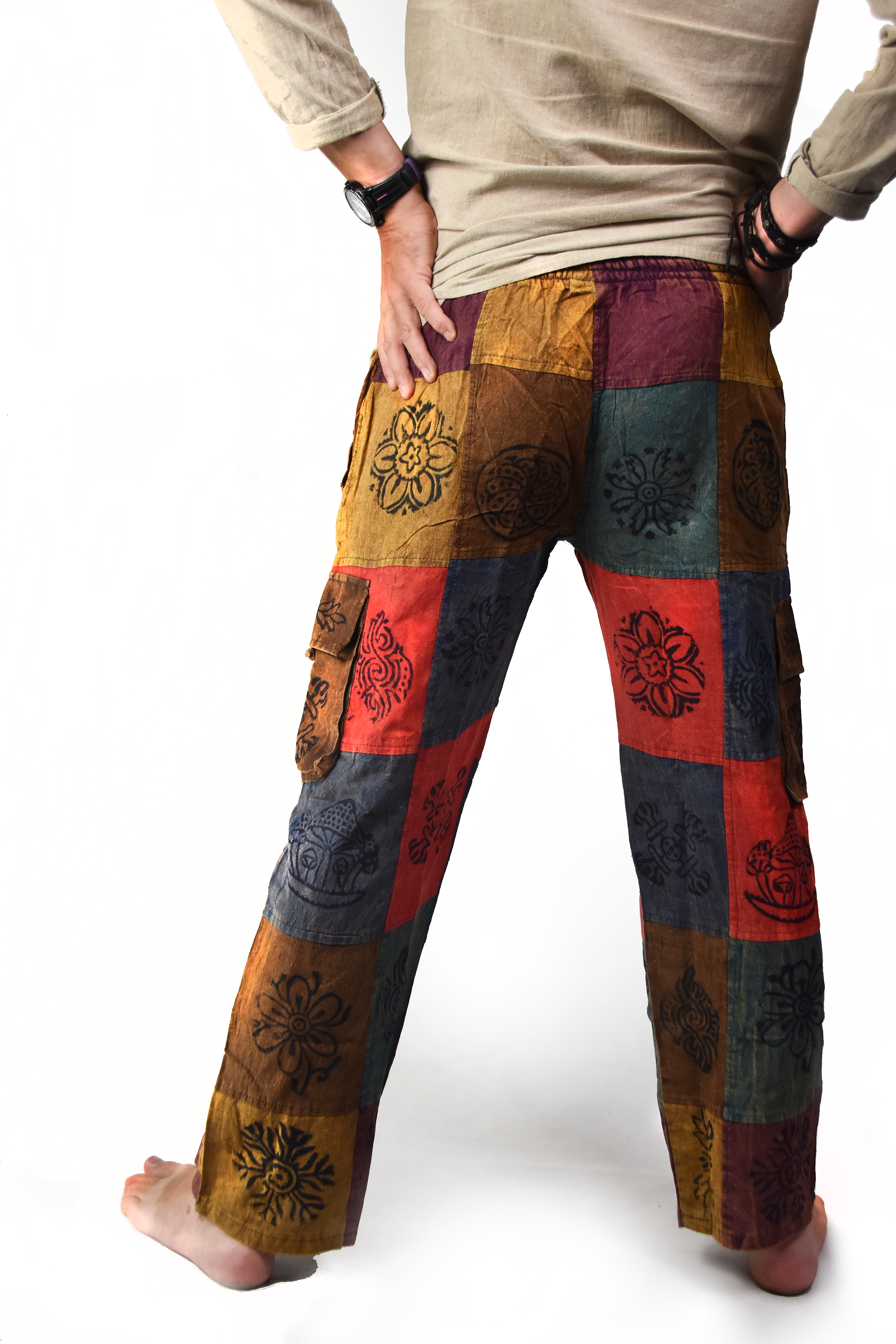 Spodnie uszyto z kolorowych kawałków cienkiego bawełnianego materiału. Dodatkowo są ozdobione odbitymi metodą stemplową symbolami hinduskimi.