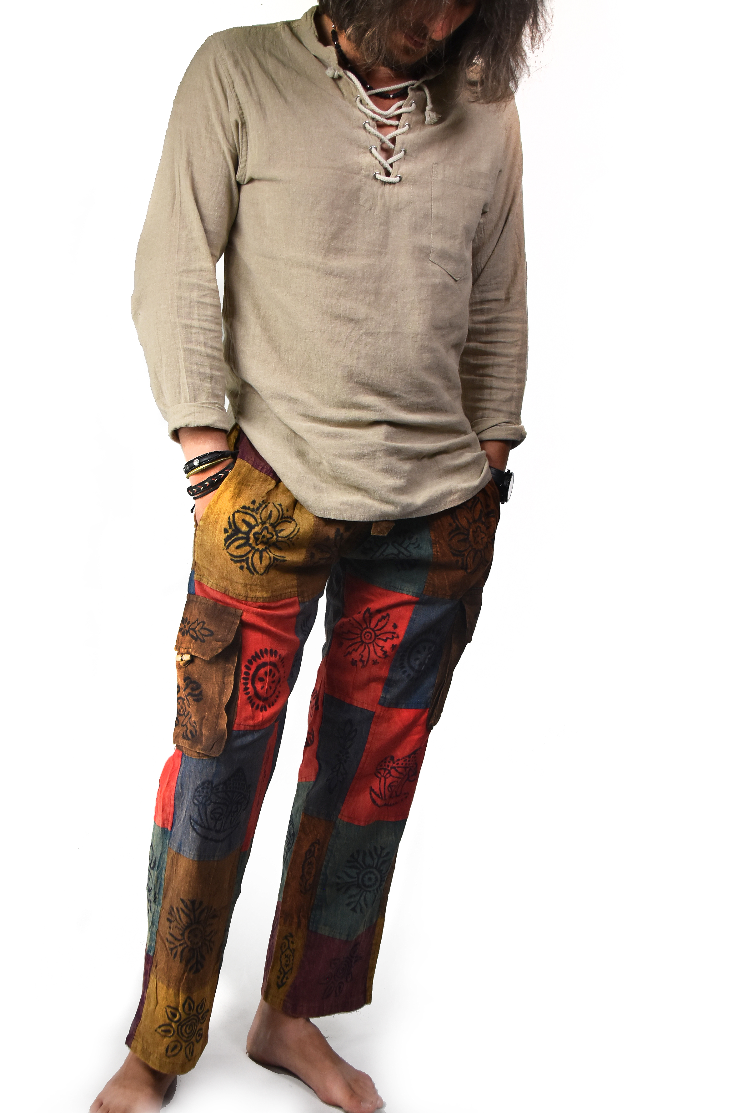 Prezentowane spodnie dotarły do nas z Nepalu. Zostały uszyte w lokalnym warsztacie krawieckim w Katmandu.