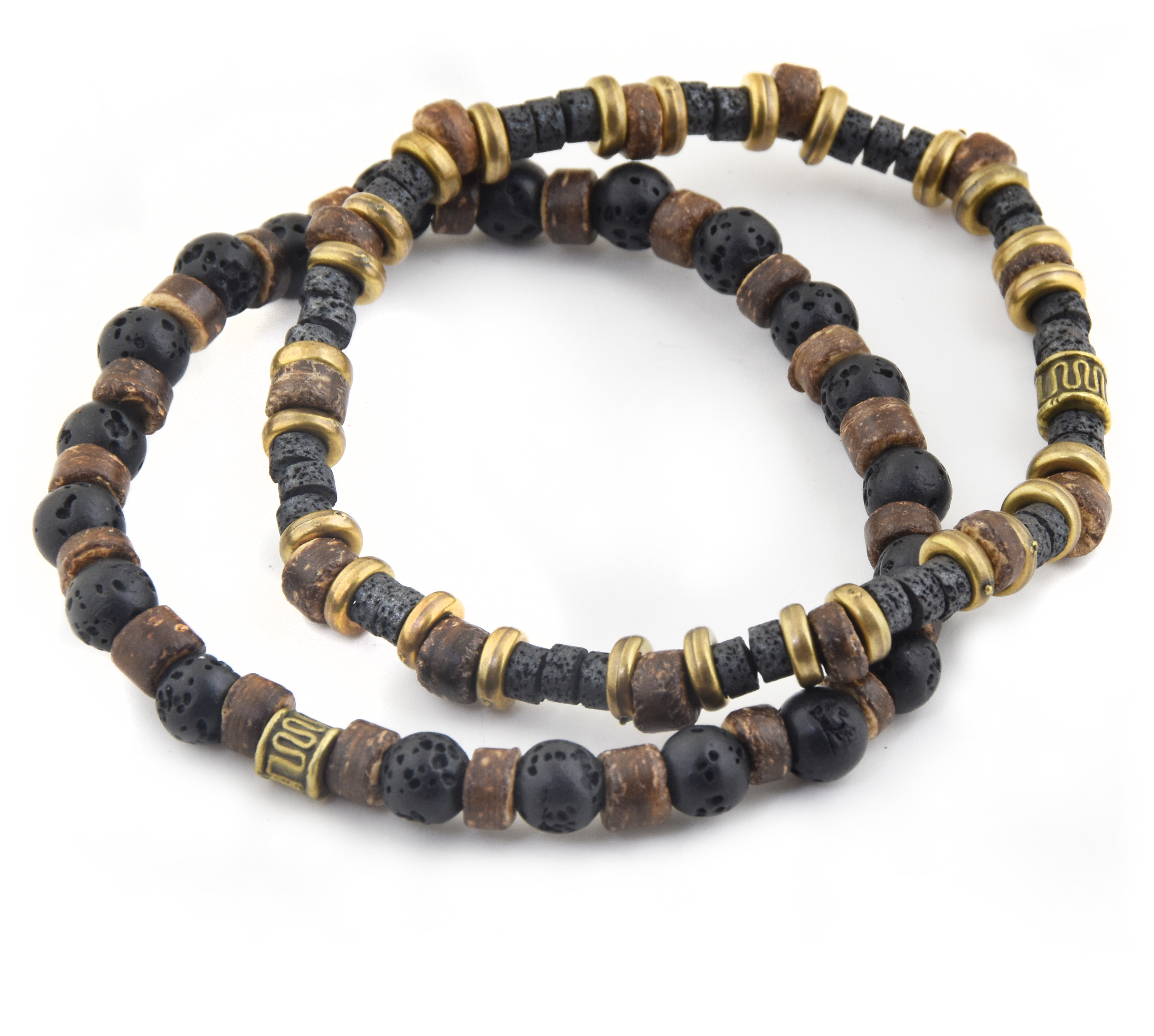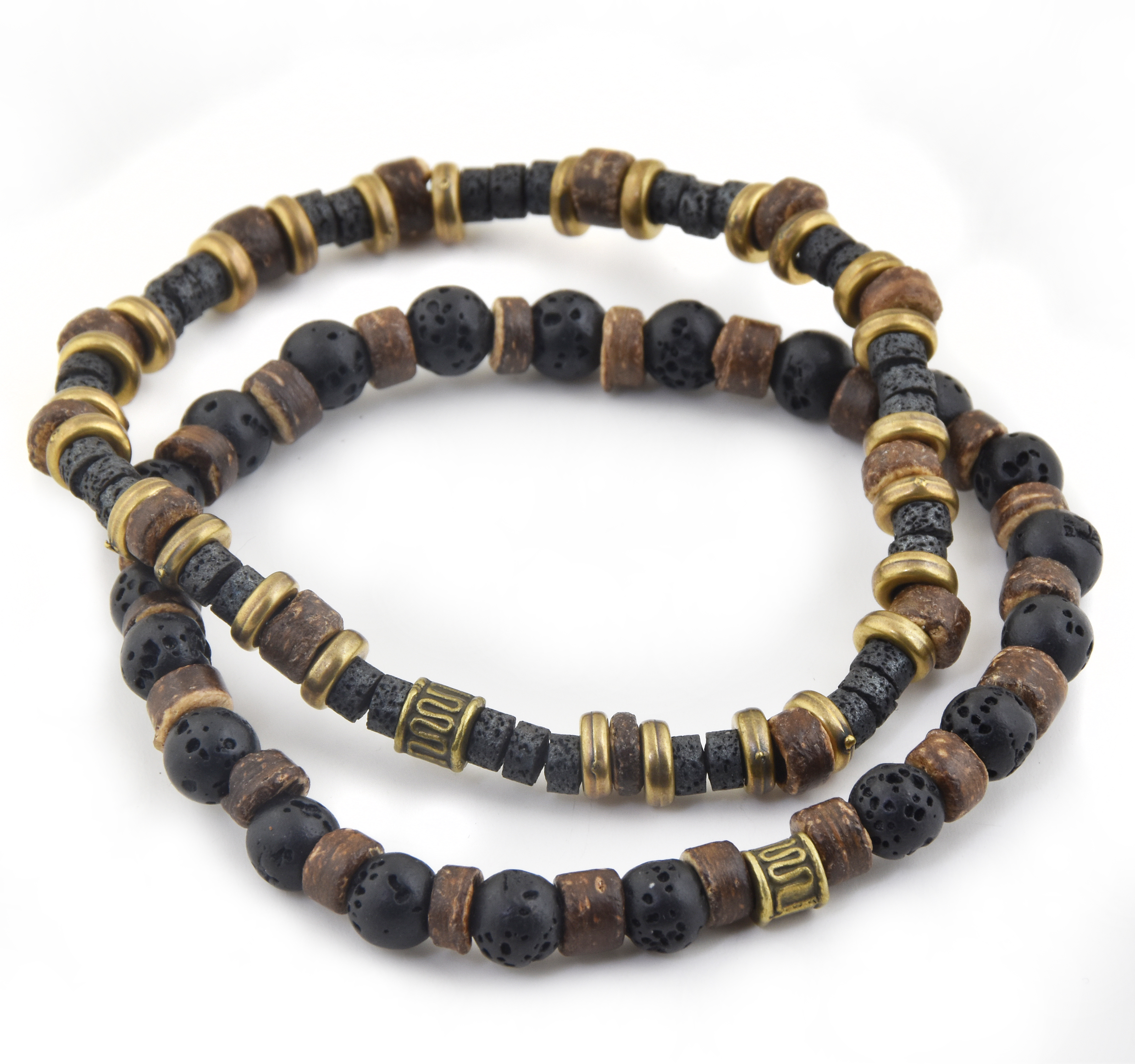 Ten zestaw dwóch bransoletek to połączenie boho, etno i lekkiego pirackiego klimatu, idealny dla osób ceniących naturalne materiały i oryginalny, niepowtarzalny styl. Bransoletki wykonane są ręcznie, z koralików z tufu wulkanicznego i łupiny kokosa, które nadają im organicznego, surowego charakteru.