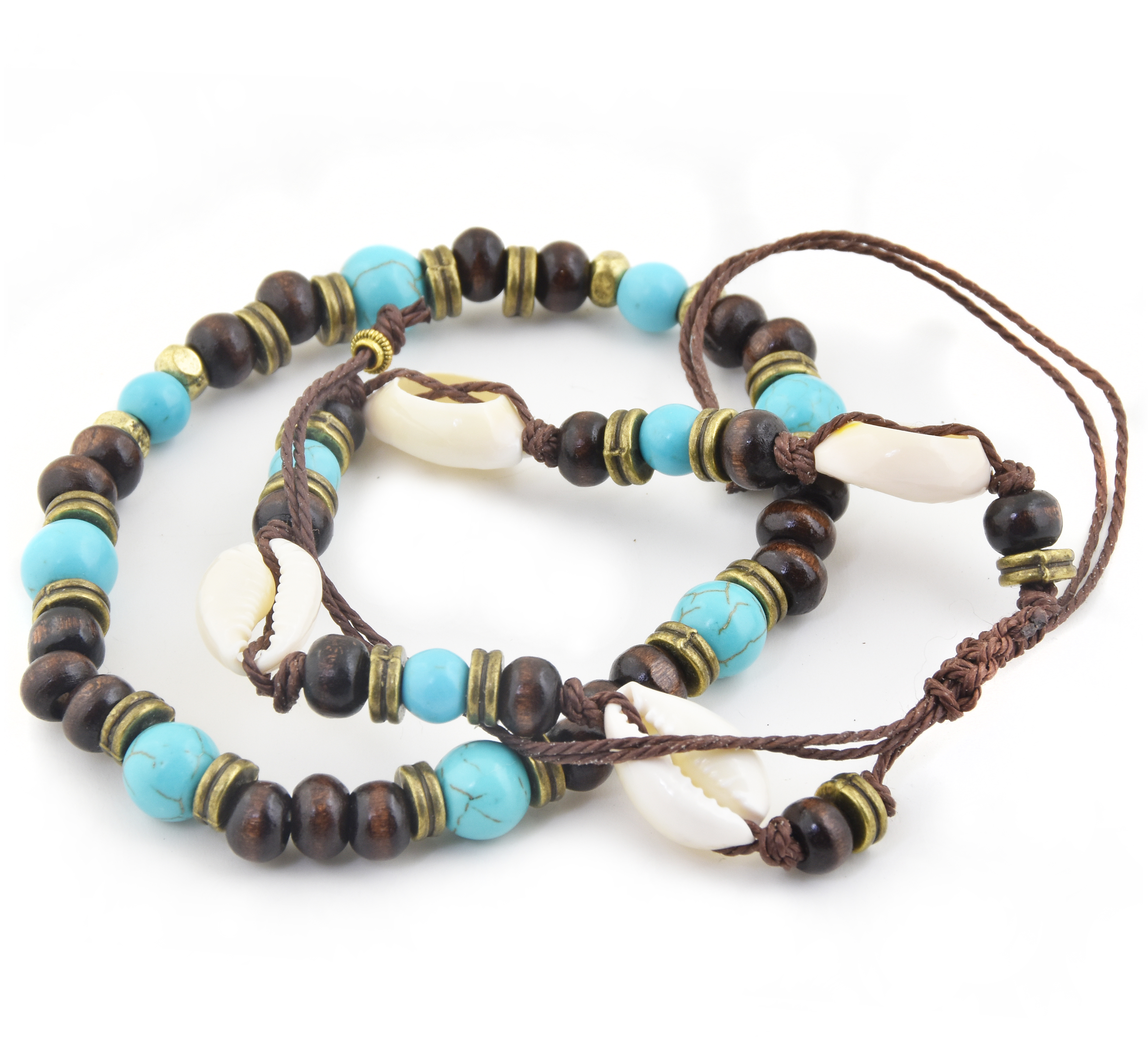 Bransoletka wiązana na nylonowej dratwie – zestaw podobnych koralików, jak w bransoletce na elastycznej żyłce, wzbogacony o cztery muszelki wykonane z twardego, syntetycznego materiału, odpornych na ścieranie i wodę (w przeciwieństwie do małych muszelek wapiennych, które są mniej trwałe).