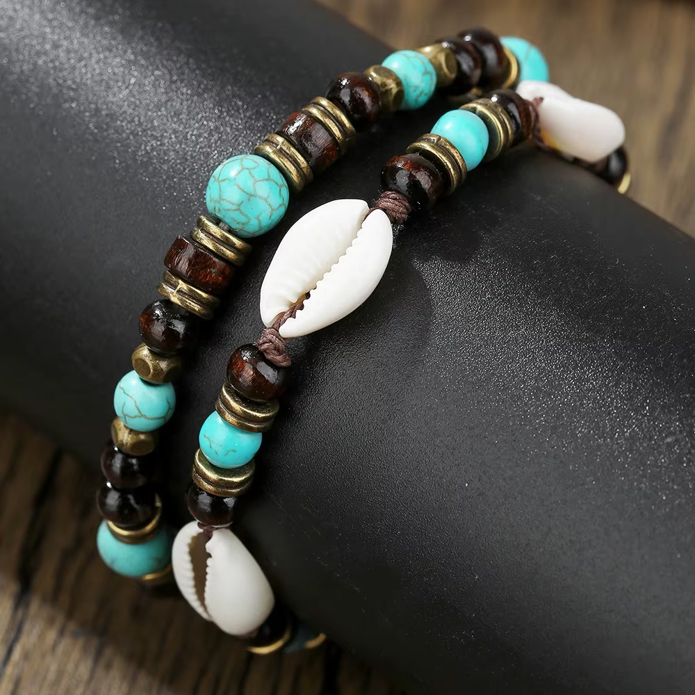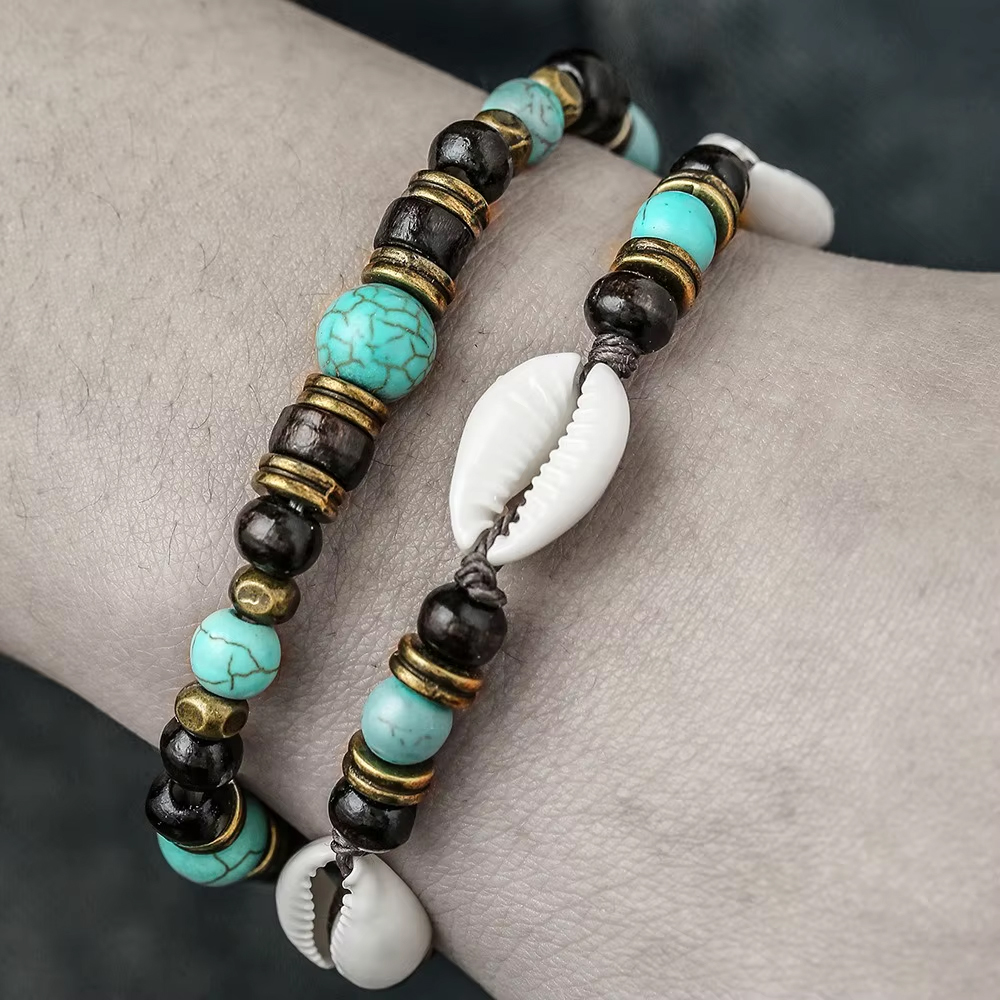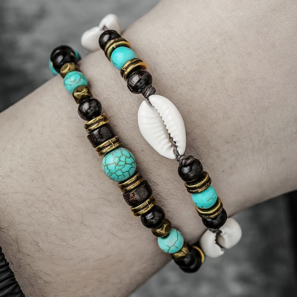 Obie bransoletki można nosić razem, tworząc radosny, morski zestaw boho, albo osobno, miksując według własnego stylu i nastroju. Połączenie drewna, kamienia i trwałych muszelek nadaje zestawowi wakacyjny, letni charakter.
