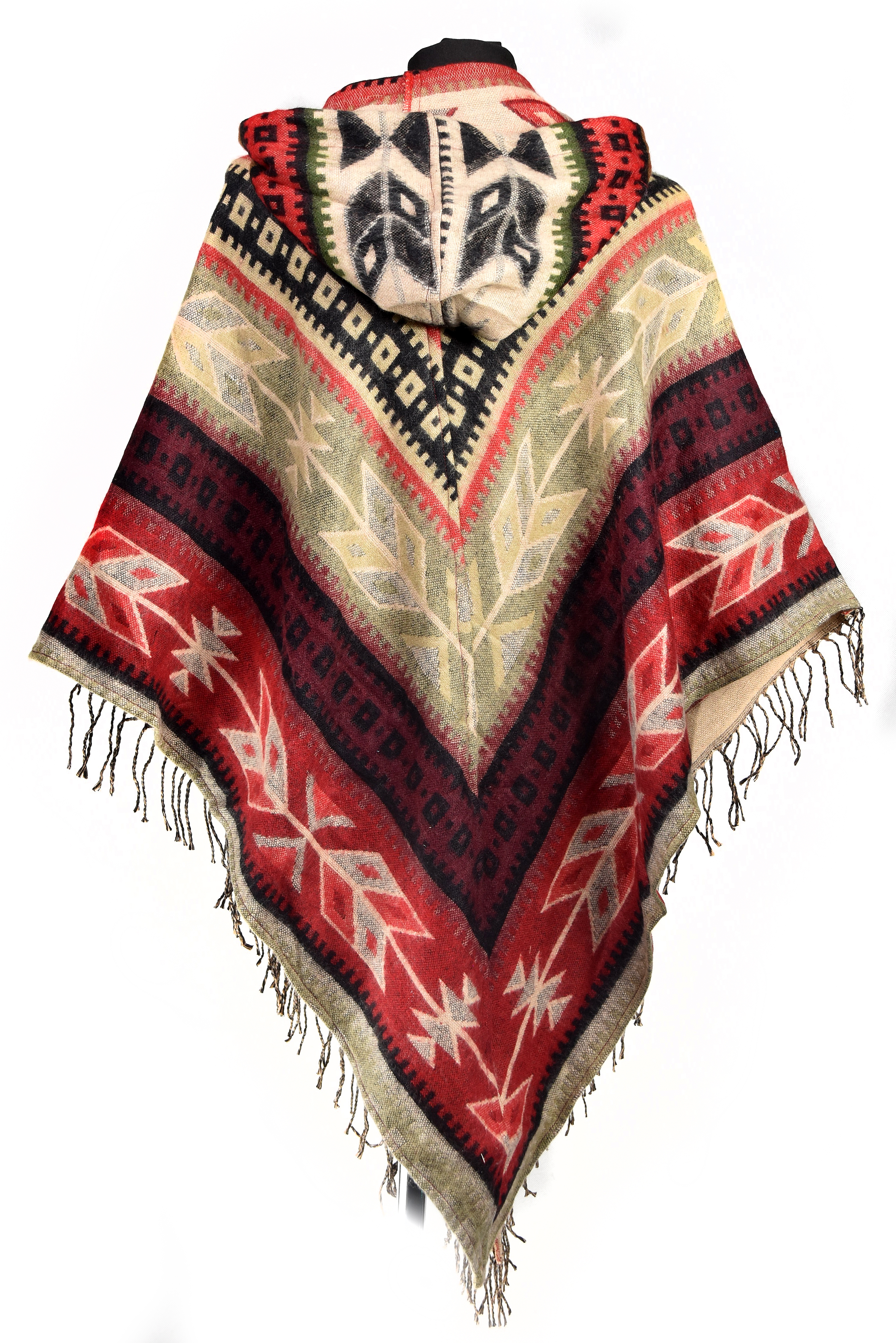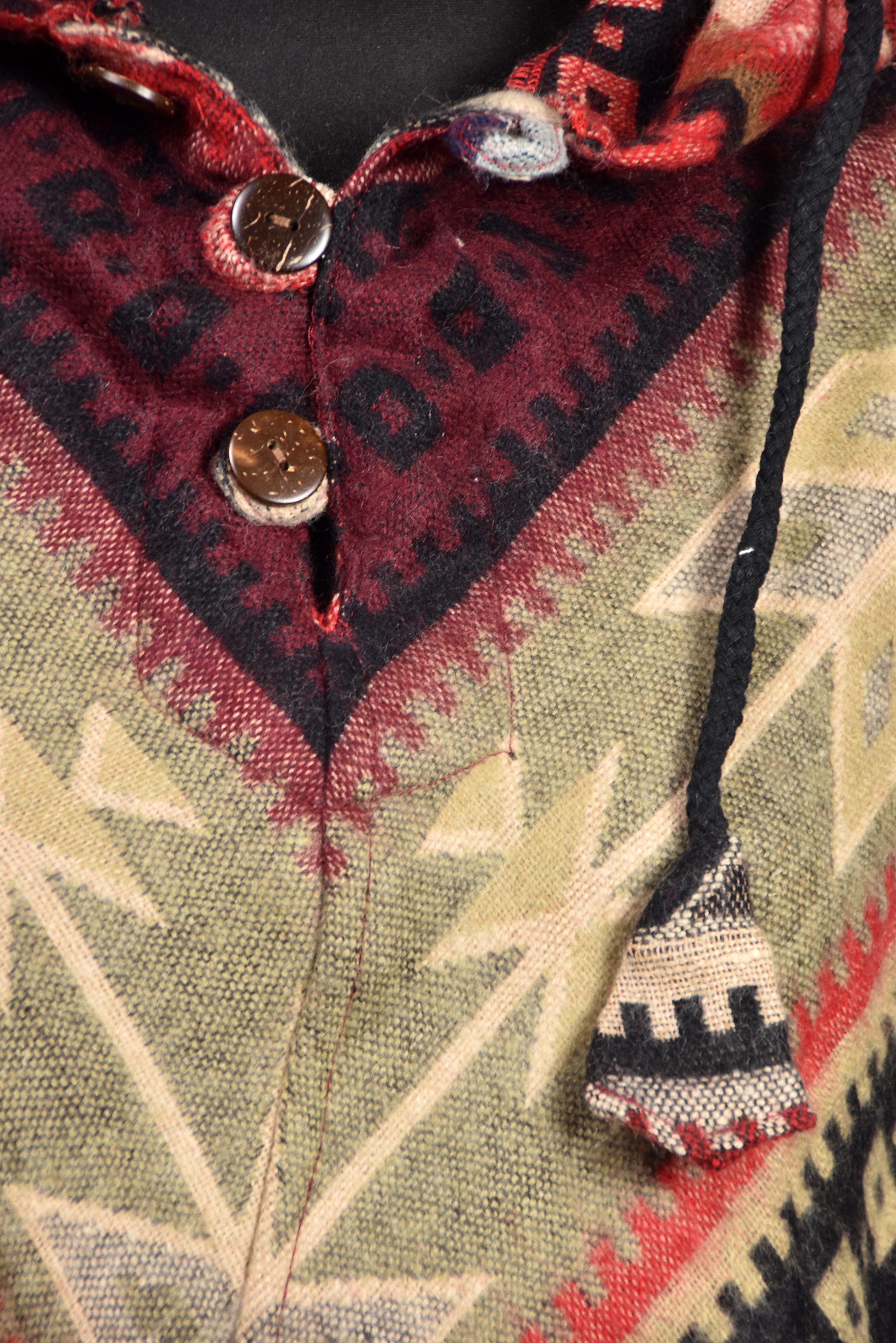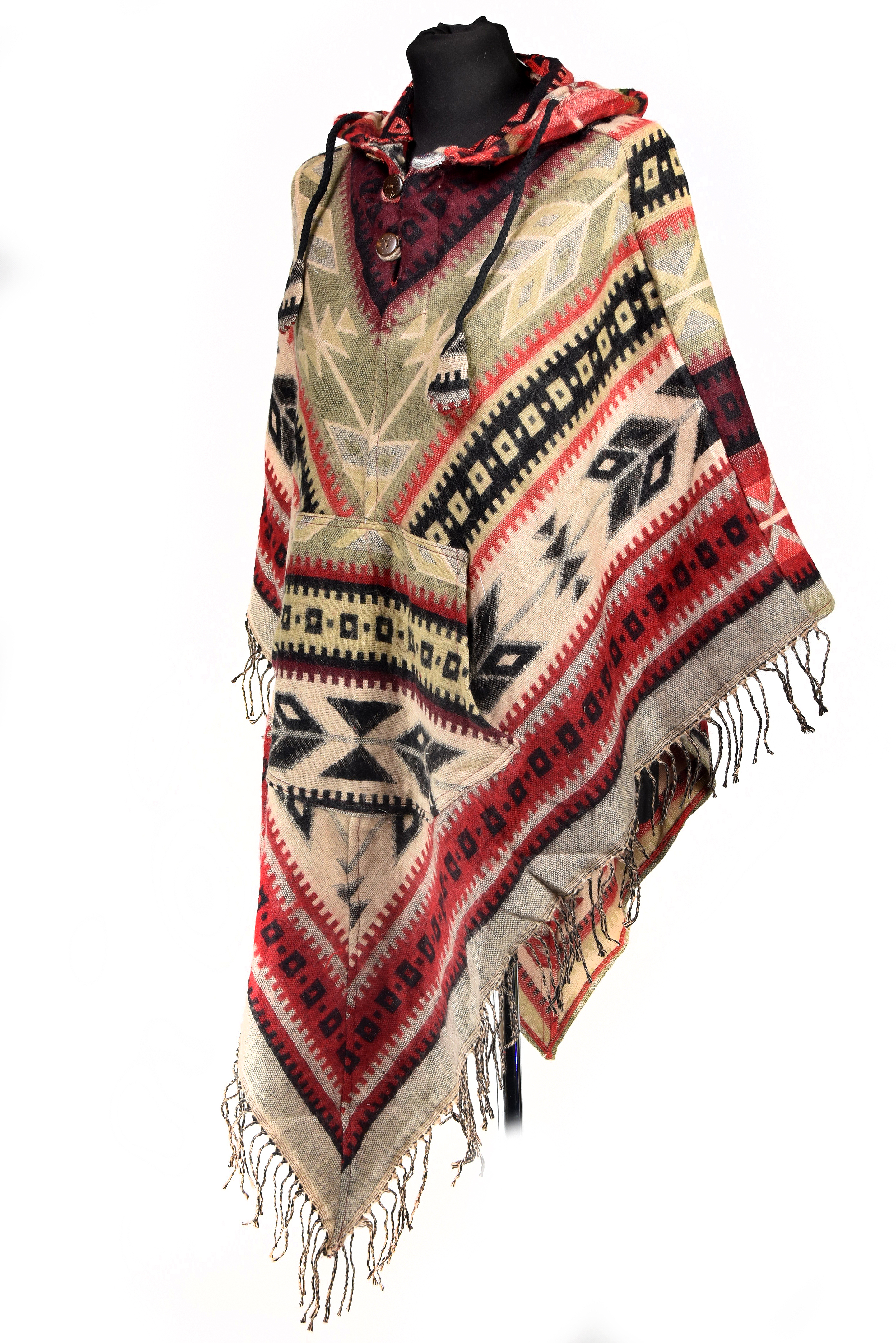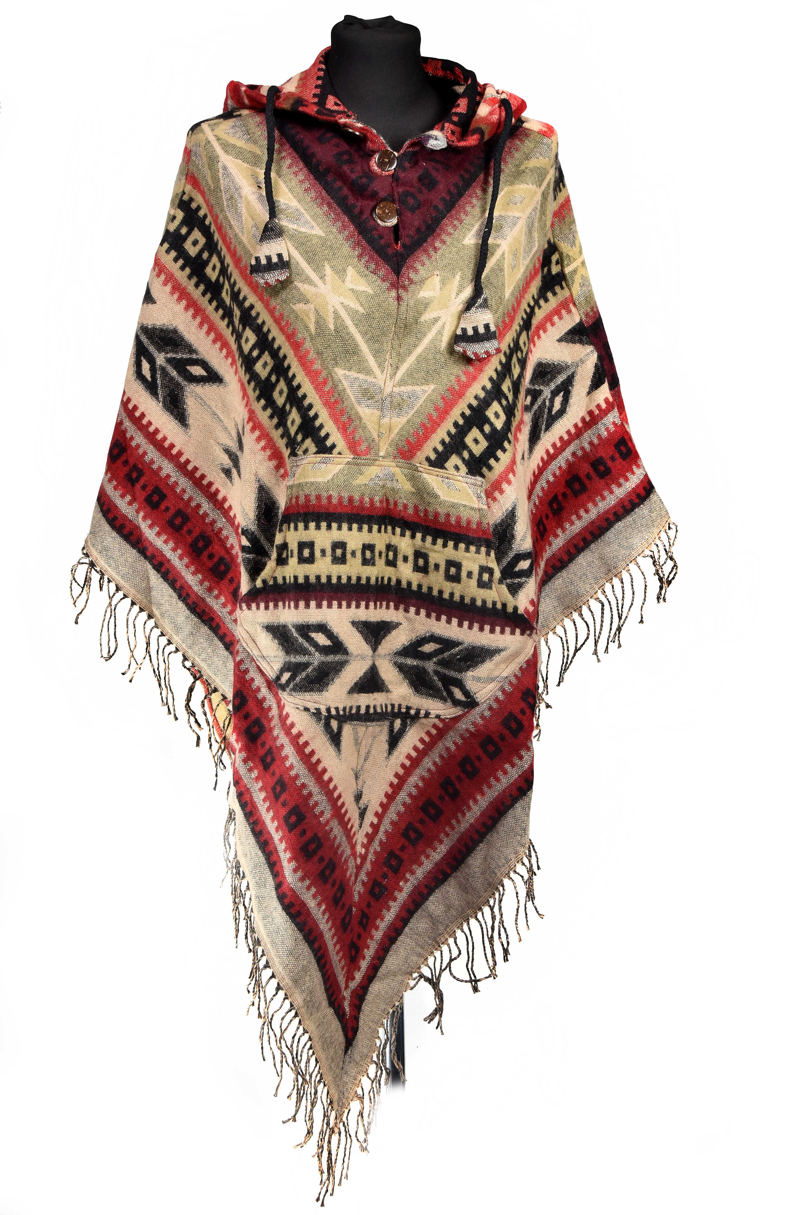 Prezentowane ponczo zostało utkane w Nepalu z 100% naturalnej wełny owczej, tradycyjną metodą ręcznego tkania na krosnach. Inspirowane stylem azteckim i indiańskim, łączy w sobie himalajską tradycję z etniczną estetyką charakterystyczną dla rdzennych kultur obu Ameryk. Dzięki temu ponczo ma niepowtarzalny charakter i pięknie wpisuje się w stylistykę boho, hippie oraz etno.