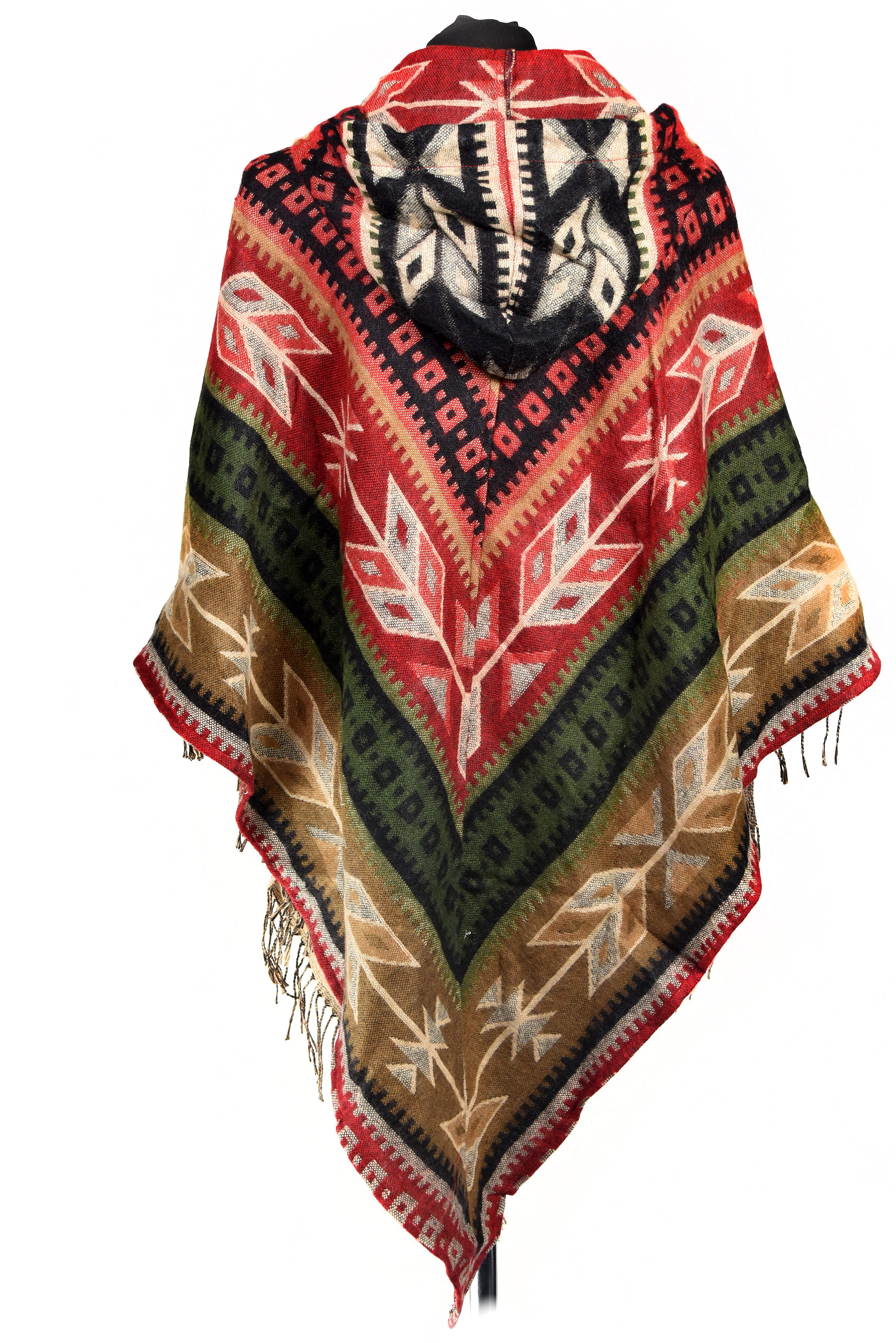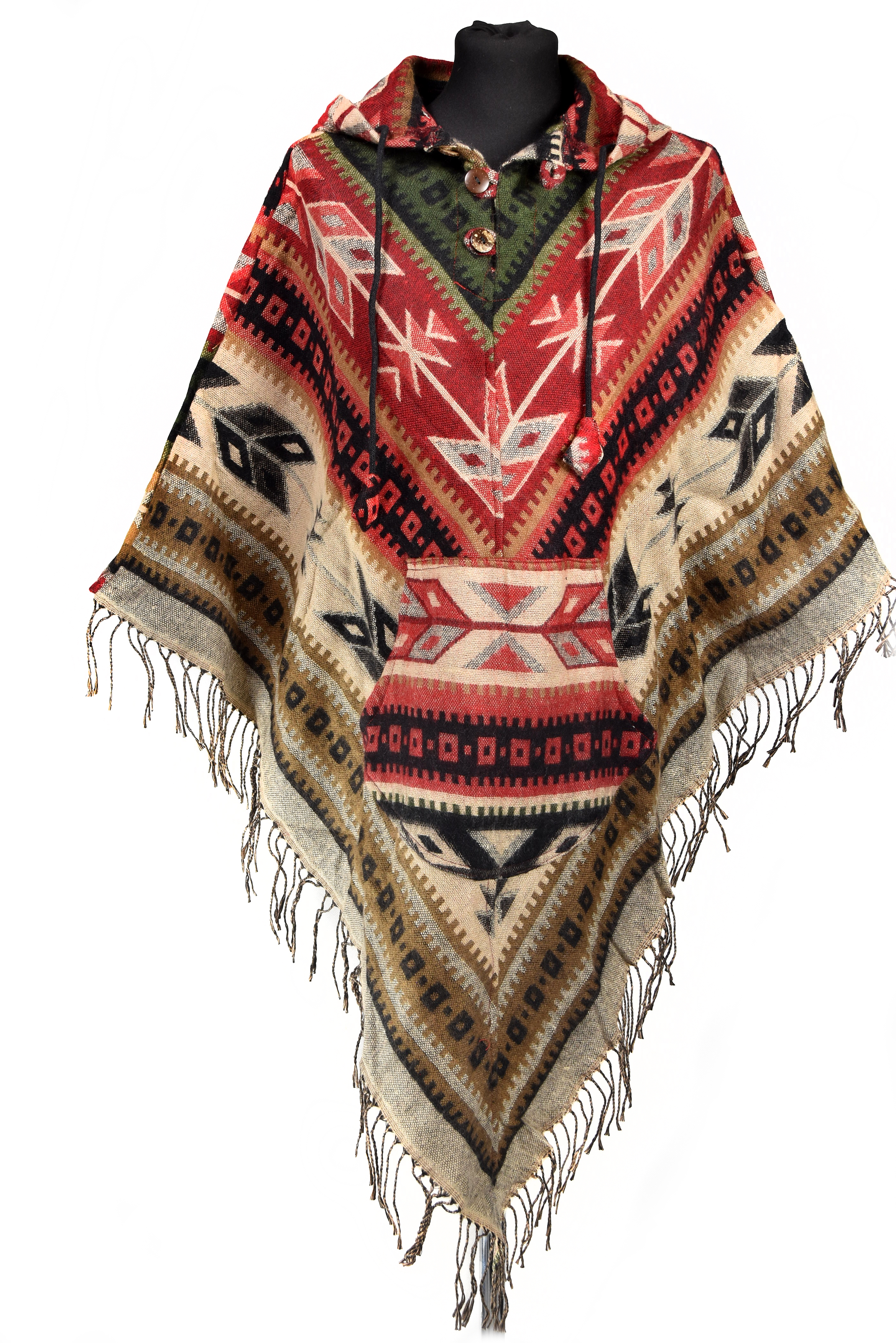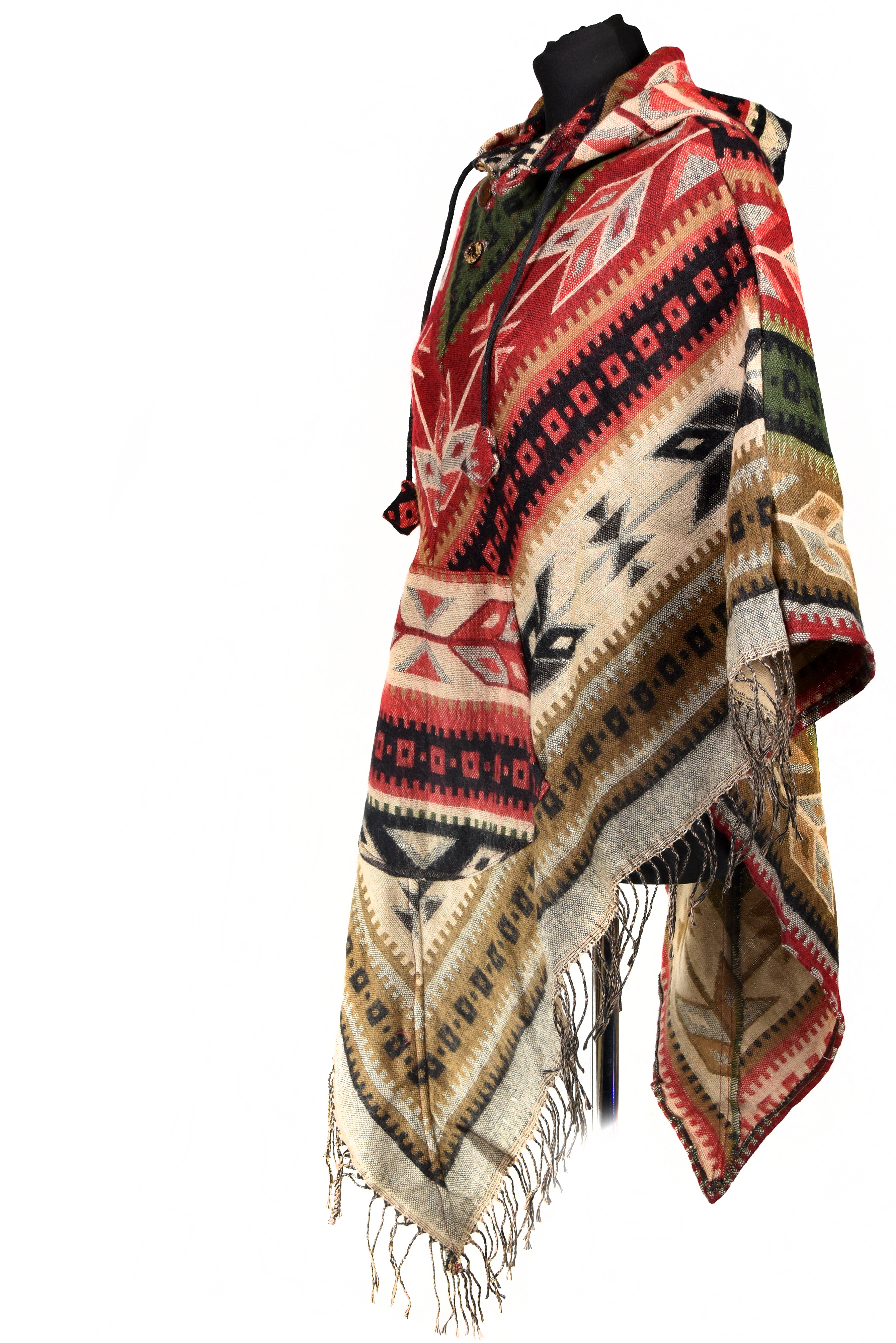 Prezentowane ponczo zostało utkane w Nepalu z 100% naturalnej wełny owczej, tradycyjną metodą ręcznego tkania na krosnach. Inspirowane stylem azteckim i indiańskim, łączy w sobie himalajską tradycję z etniczną estetyką charakterystyczną dla rdzennych kultur obu Ameryk. Dzięki temu ponczo ma niepowtarzalny charakter i pięknie wpisuje się w stylistykę boho, hippie oraz etno.