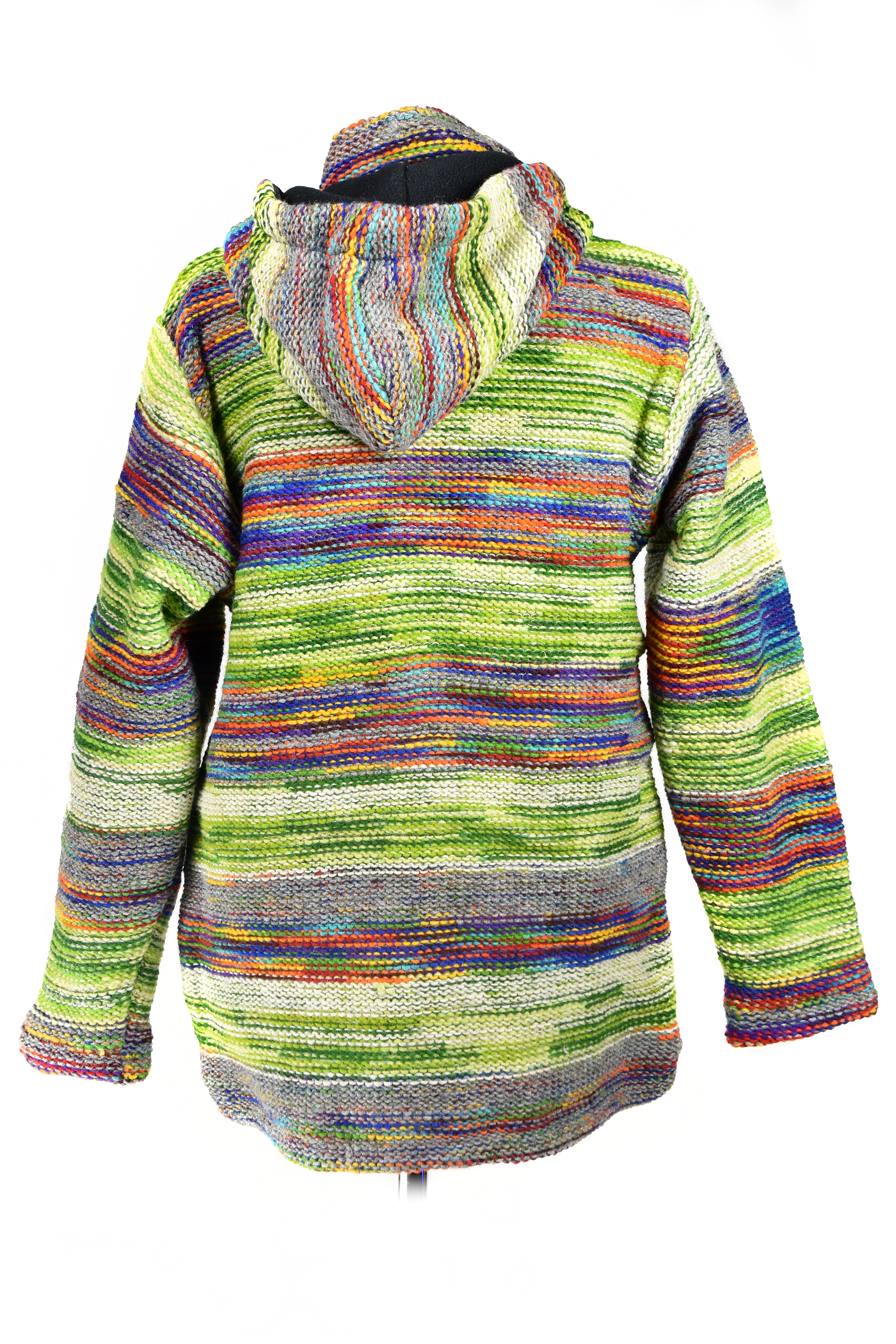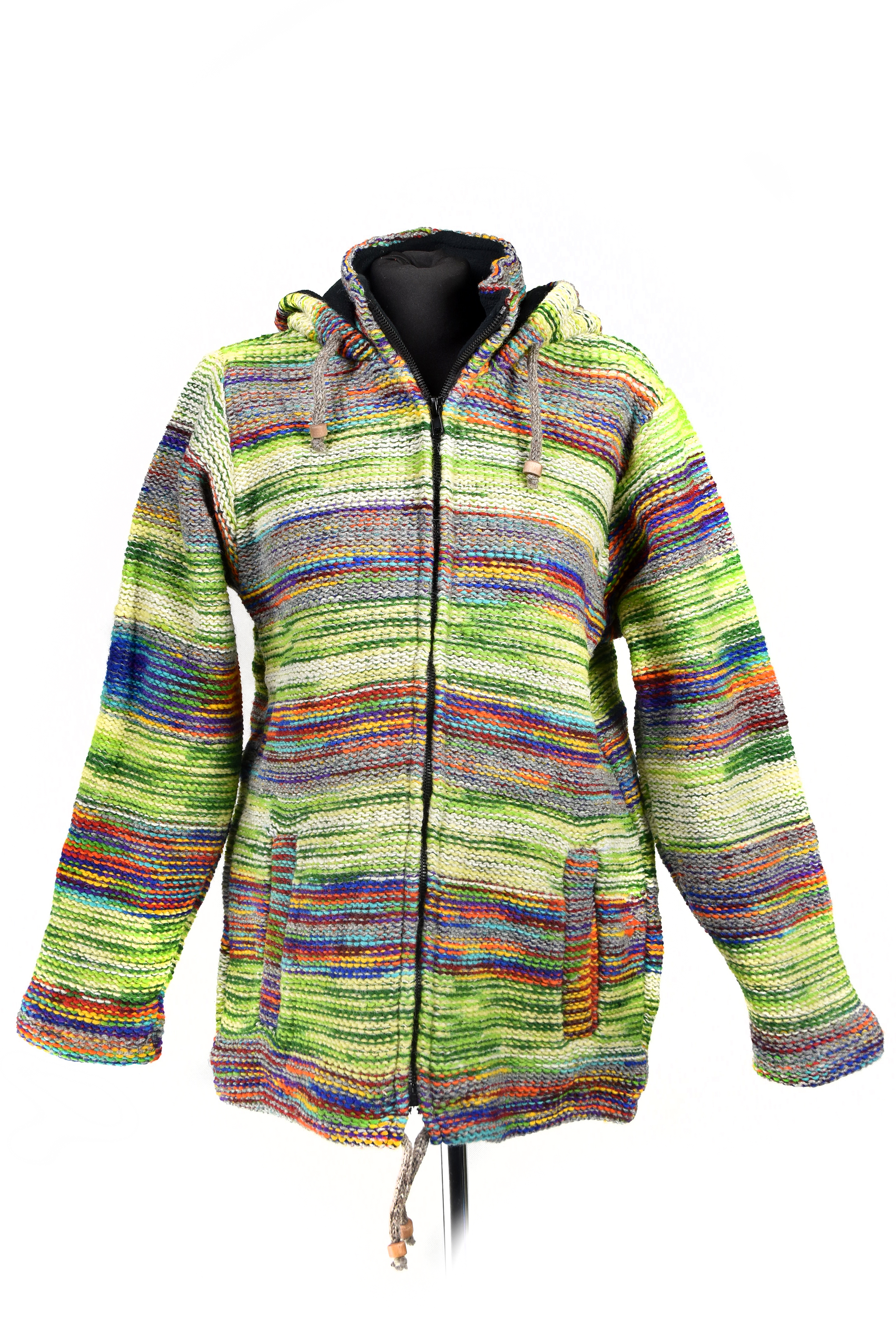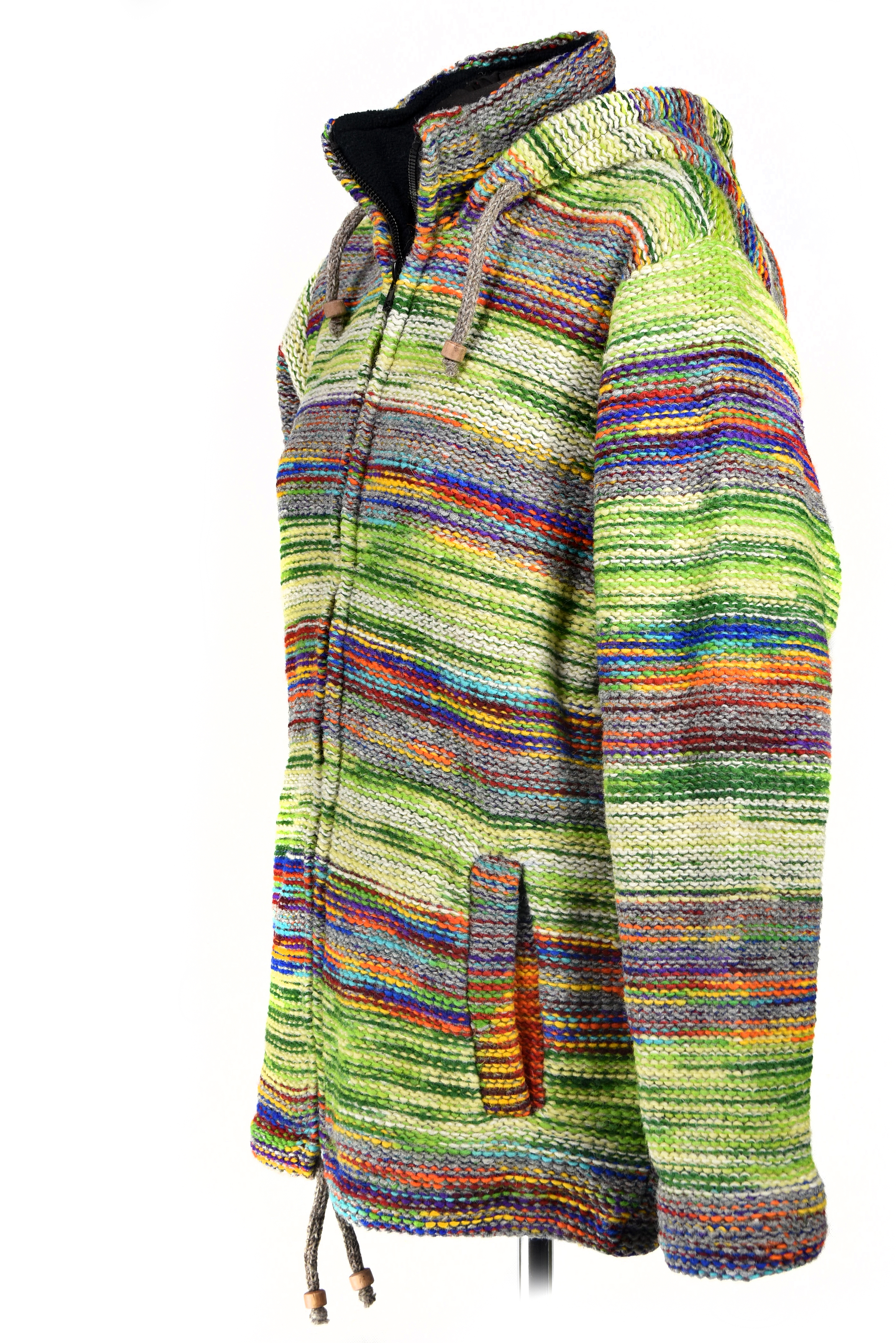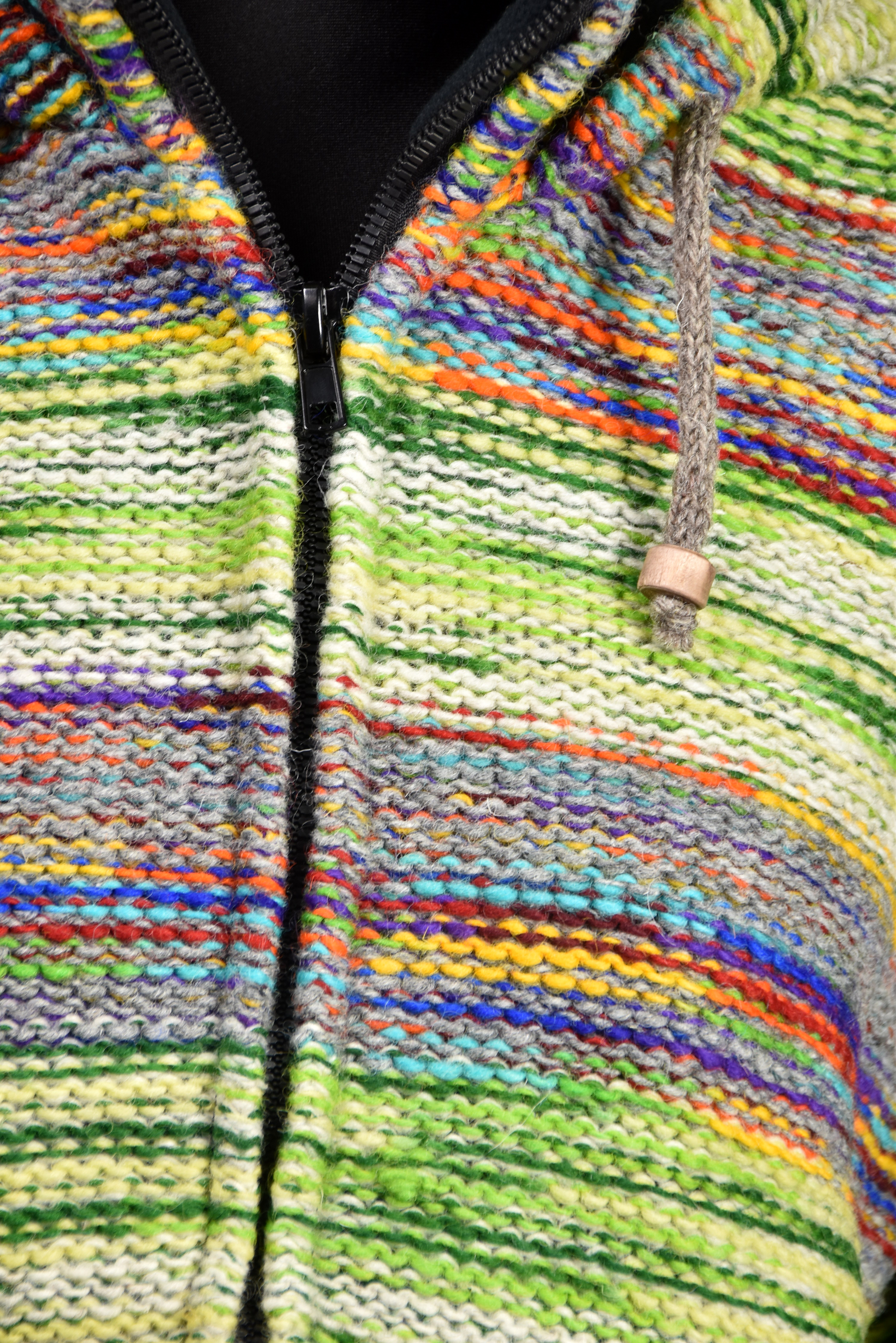 Sweter jest zapinany na gruby plastikowy zamek. Zarówno dół jak i kaptur ma ściągacz w postaci plecionego wełnianego sznurka zakończonego drewnianymi kuleczkami.