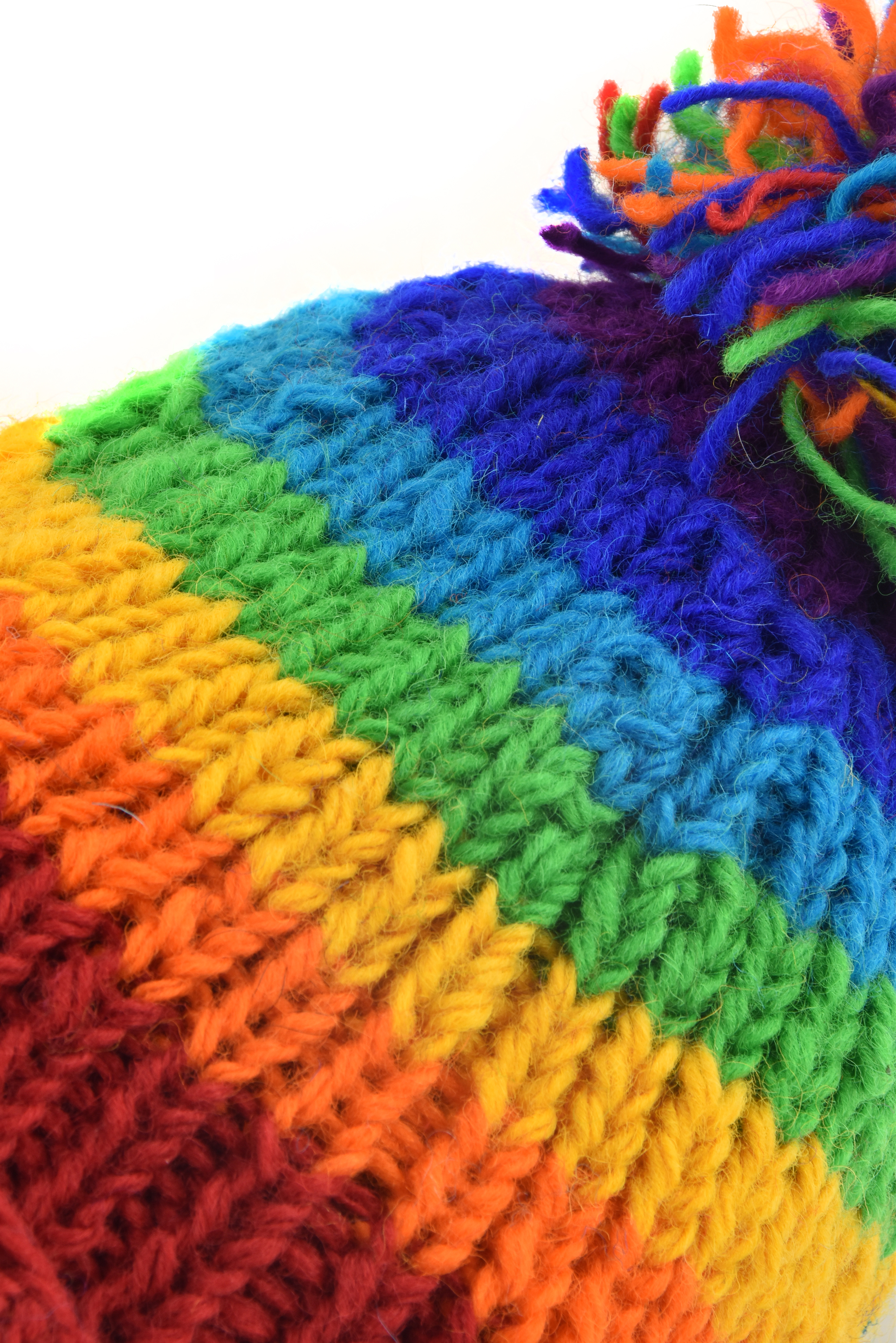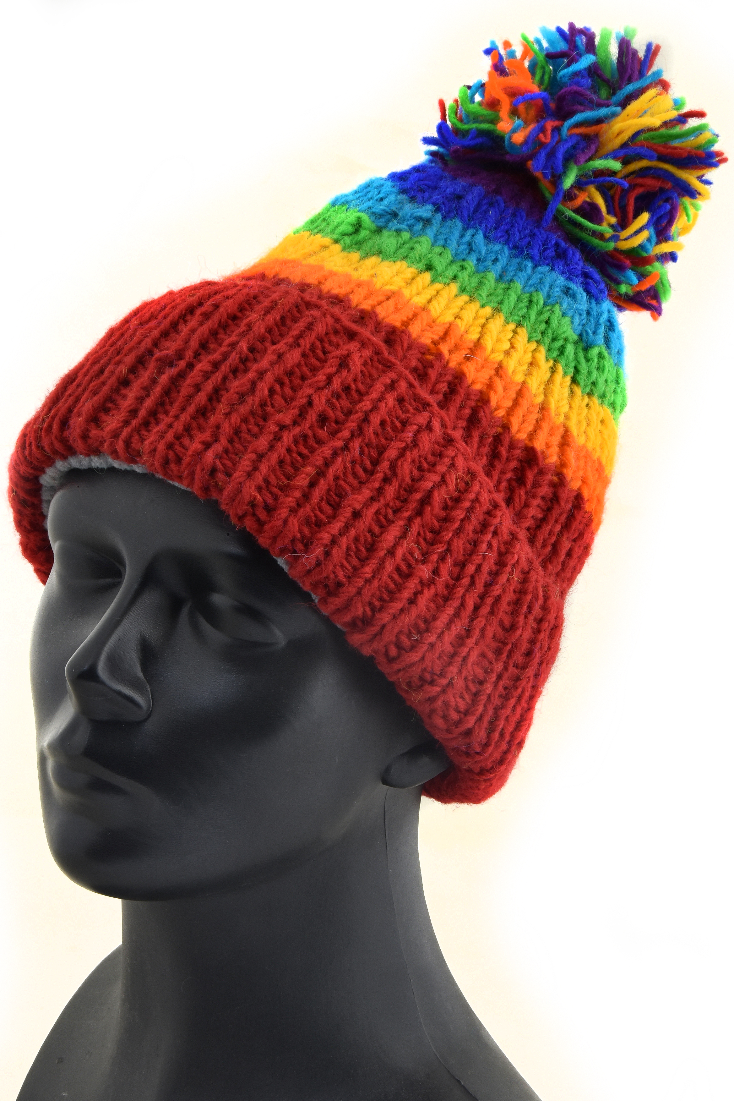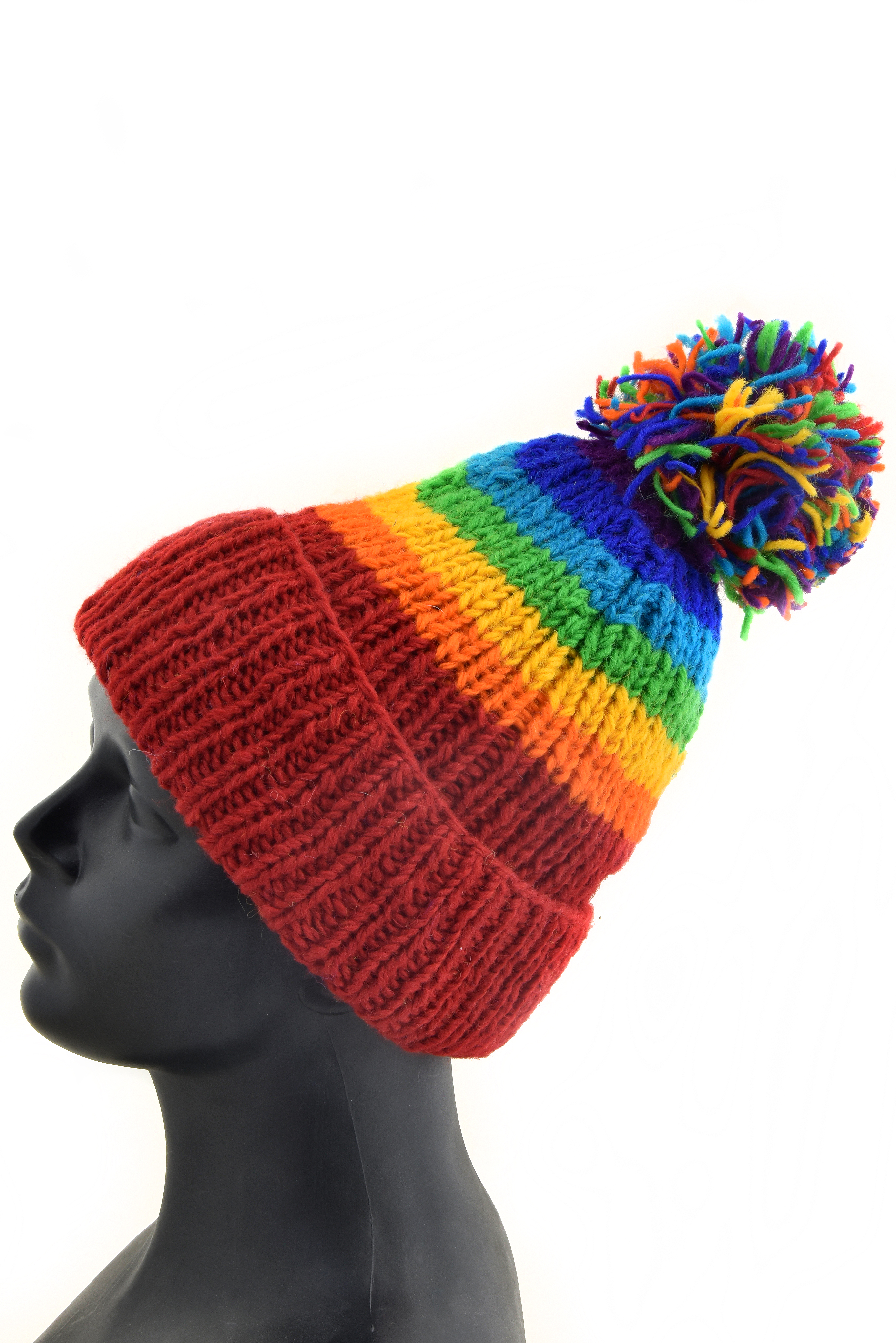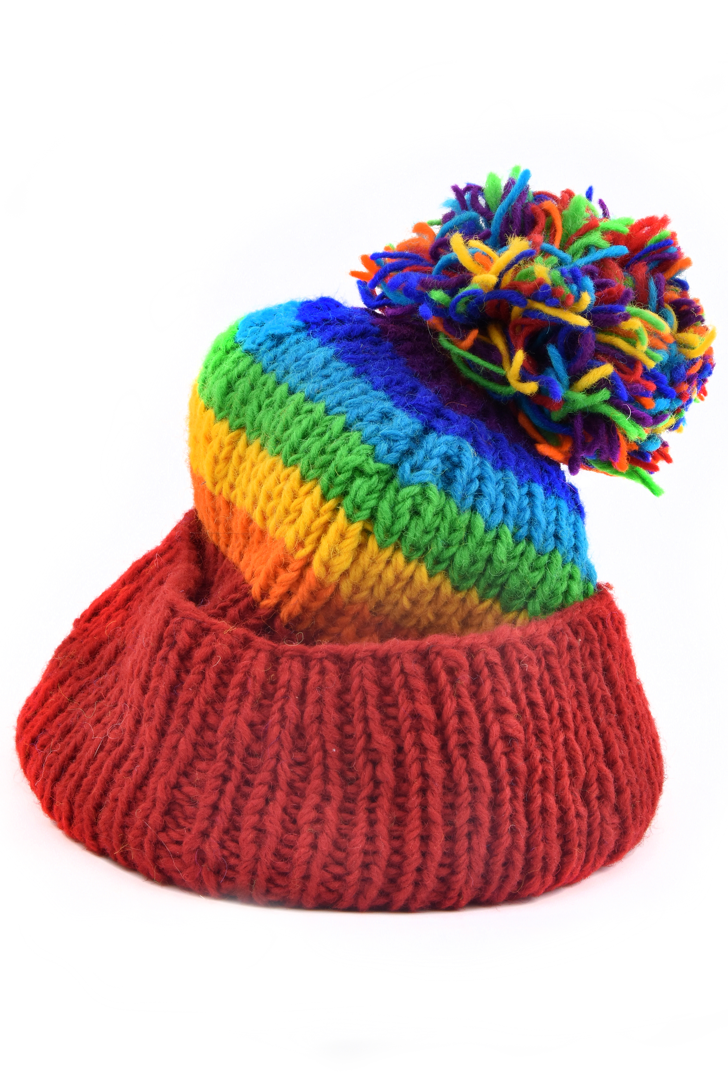 Czapka zachwyca grubymi, poziomymi pasami w intensywnych, tęczowych kolorach. Każdy kolor występuje tylko raz, co nadaje jej wyrazisty, niepowtarzalny charakter. Jaskrawe barwy idealnie wpisują się w estetykę hippie, boho, dodając stylizacji luzu i pozytywnej energii.