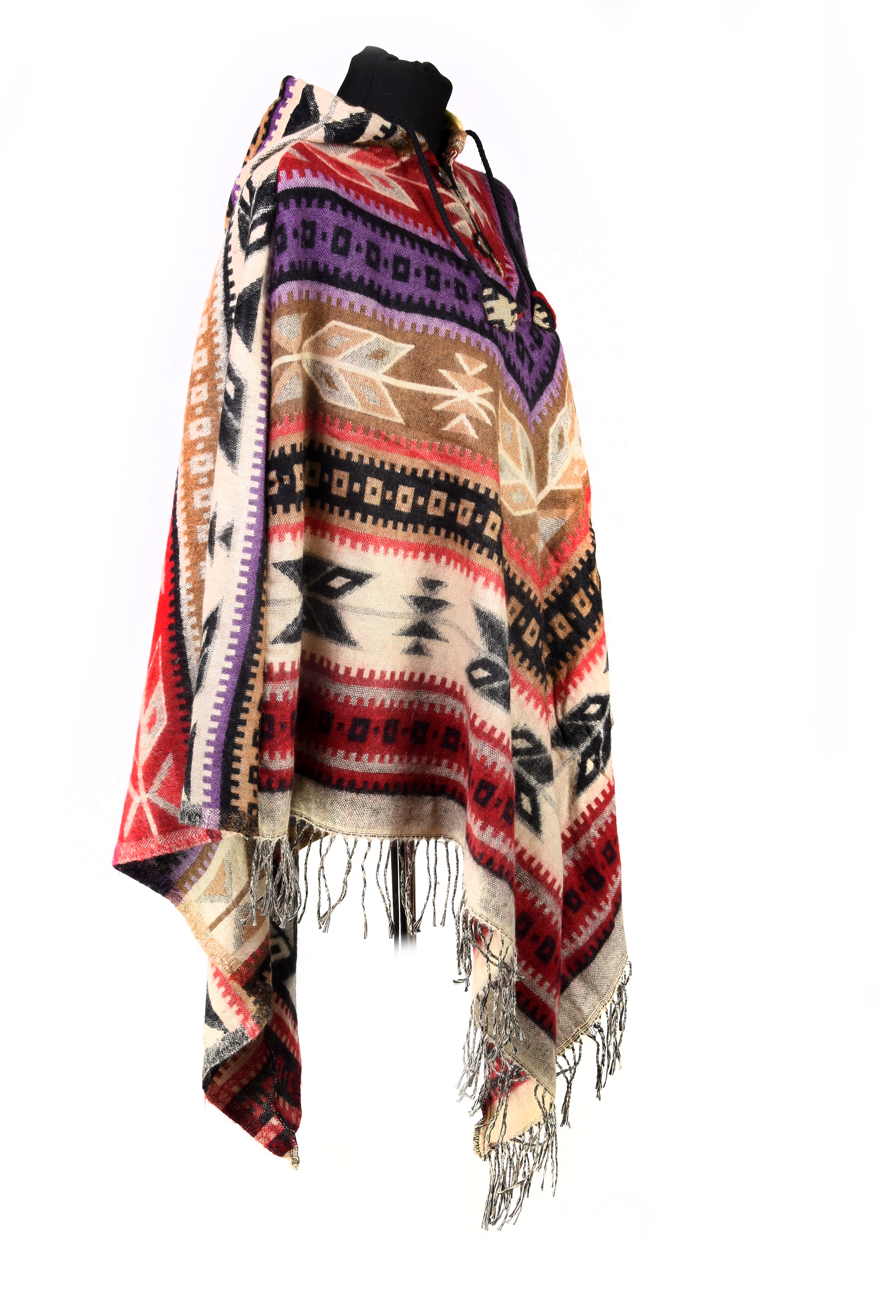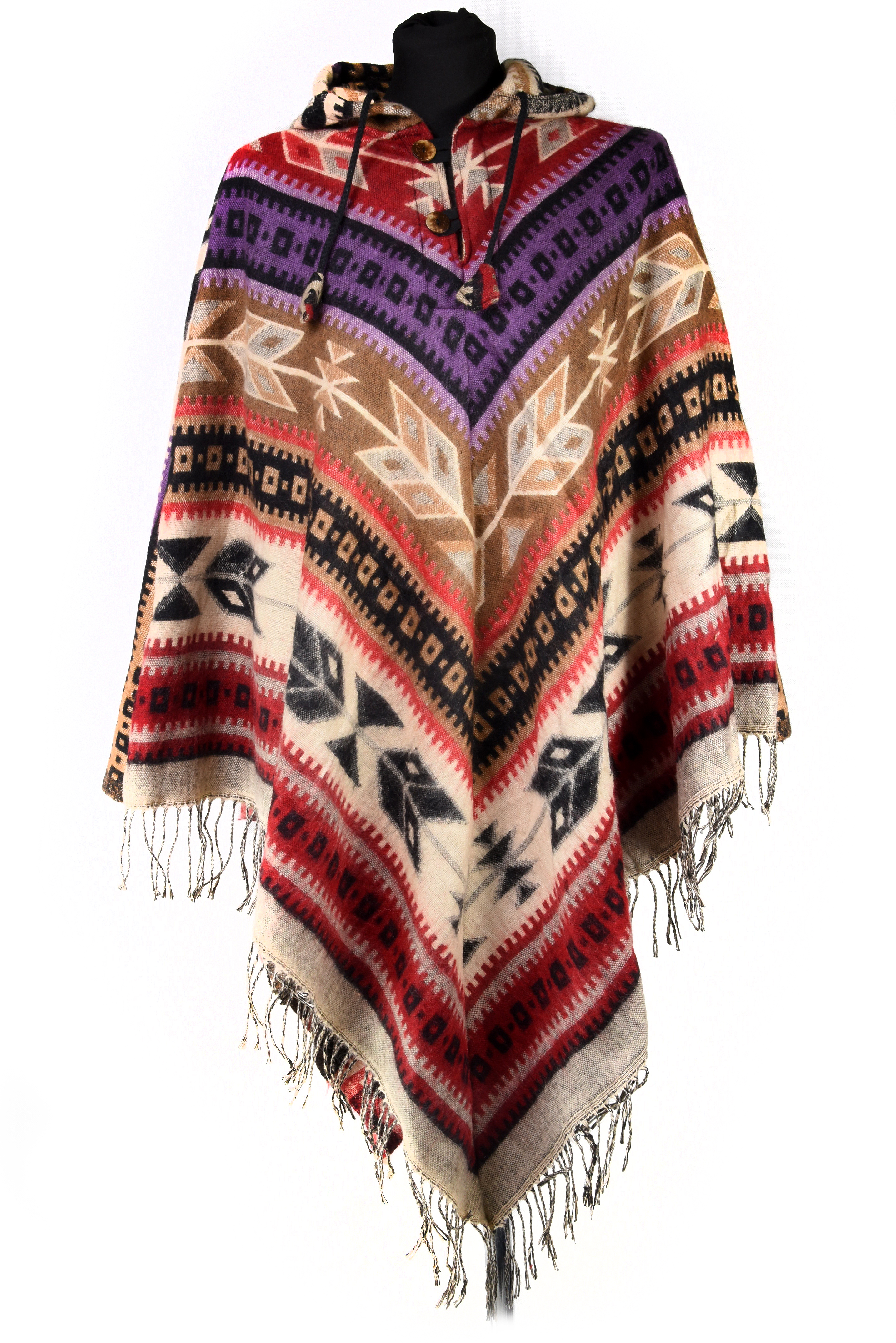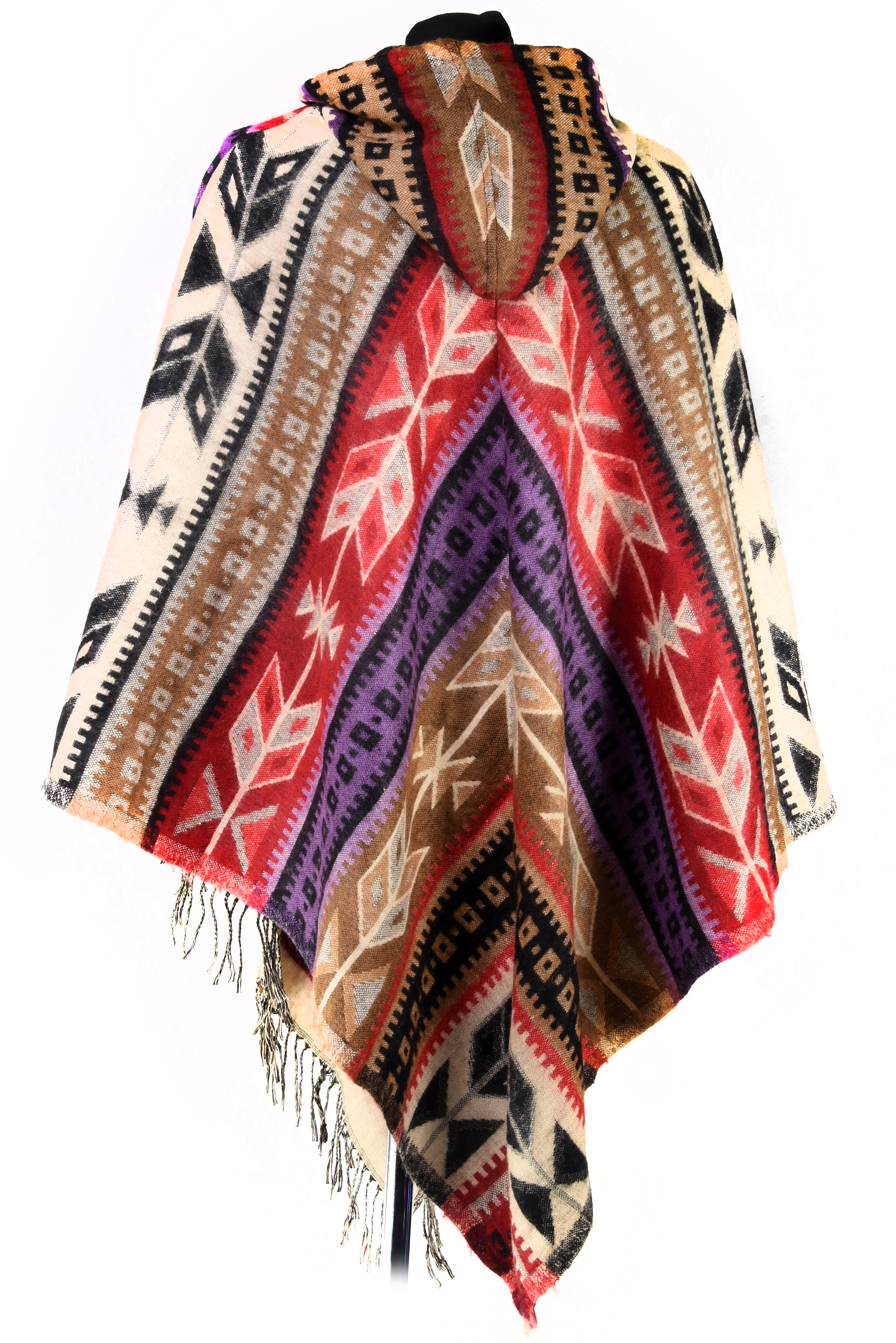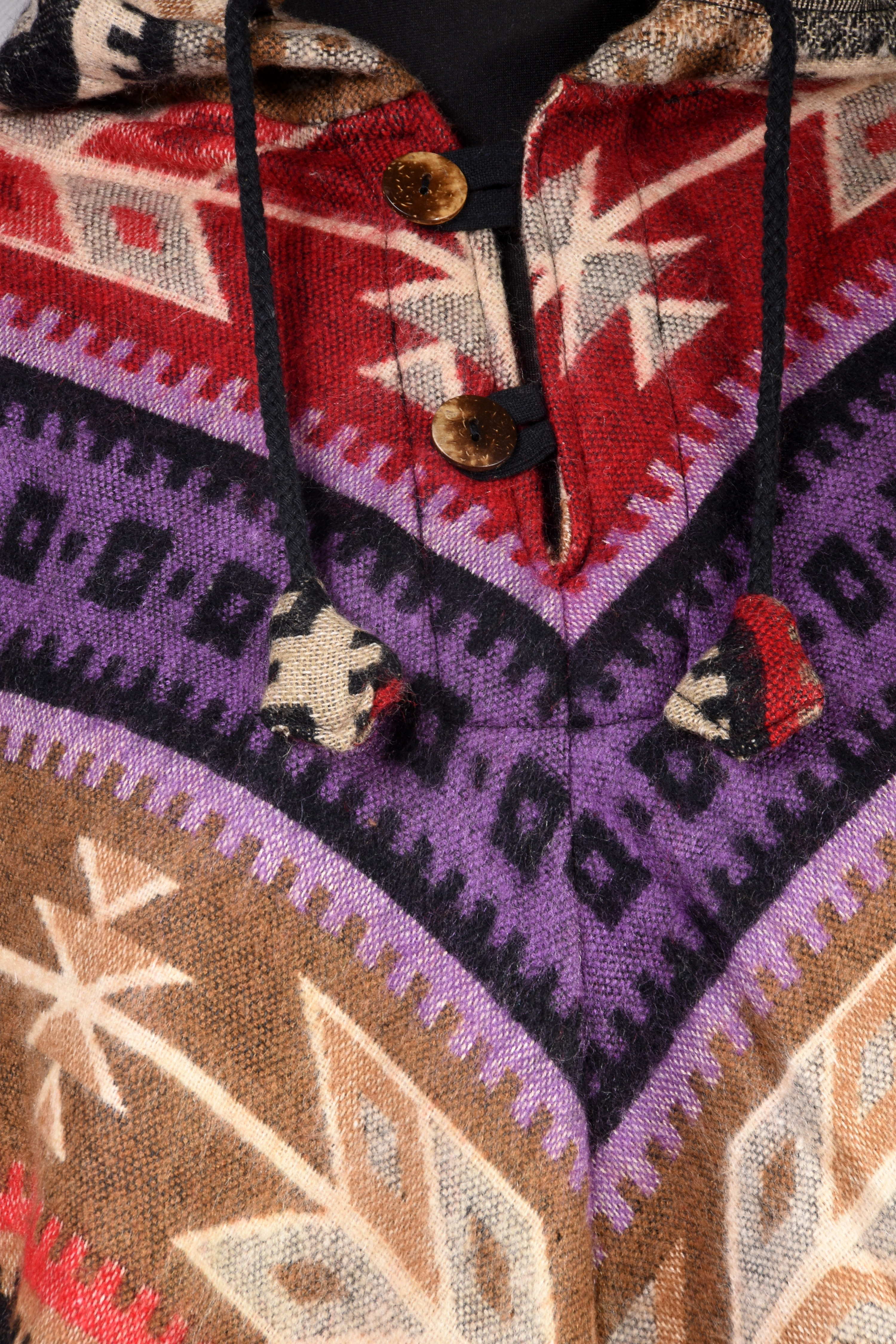 Prezentowane ponczo zostało utkane w Nepalu z bawełny, tradycyjną metodą ręcznego tkania na krosnach. Inspirowane stylem azteckim i indiańskim, łączy w sobie himalajską tradycję z etniczną estetyką charakterystyczną dla rdzennych kultur obu Ameryk. Dzięki temu ponczo ma niepowtarzalny charakter i pięknie wpisuje się w stylistykę boho, hippie oraz etno.