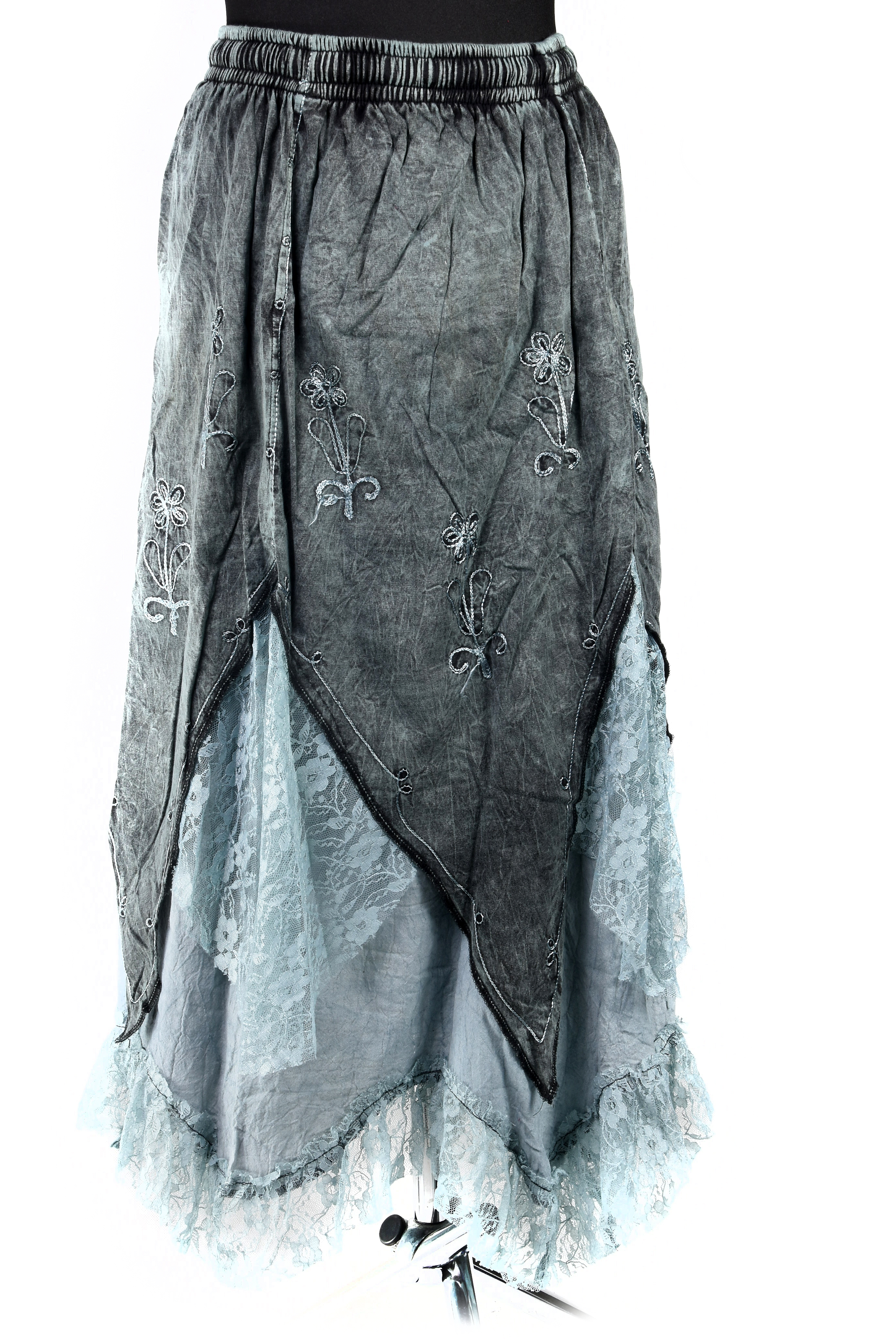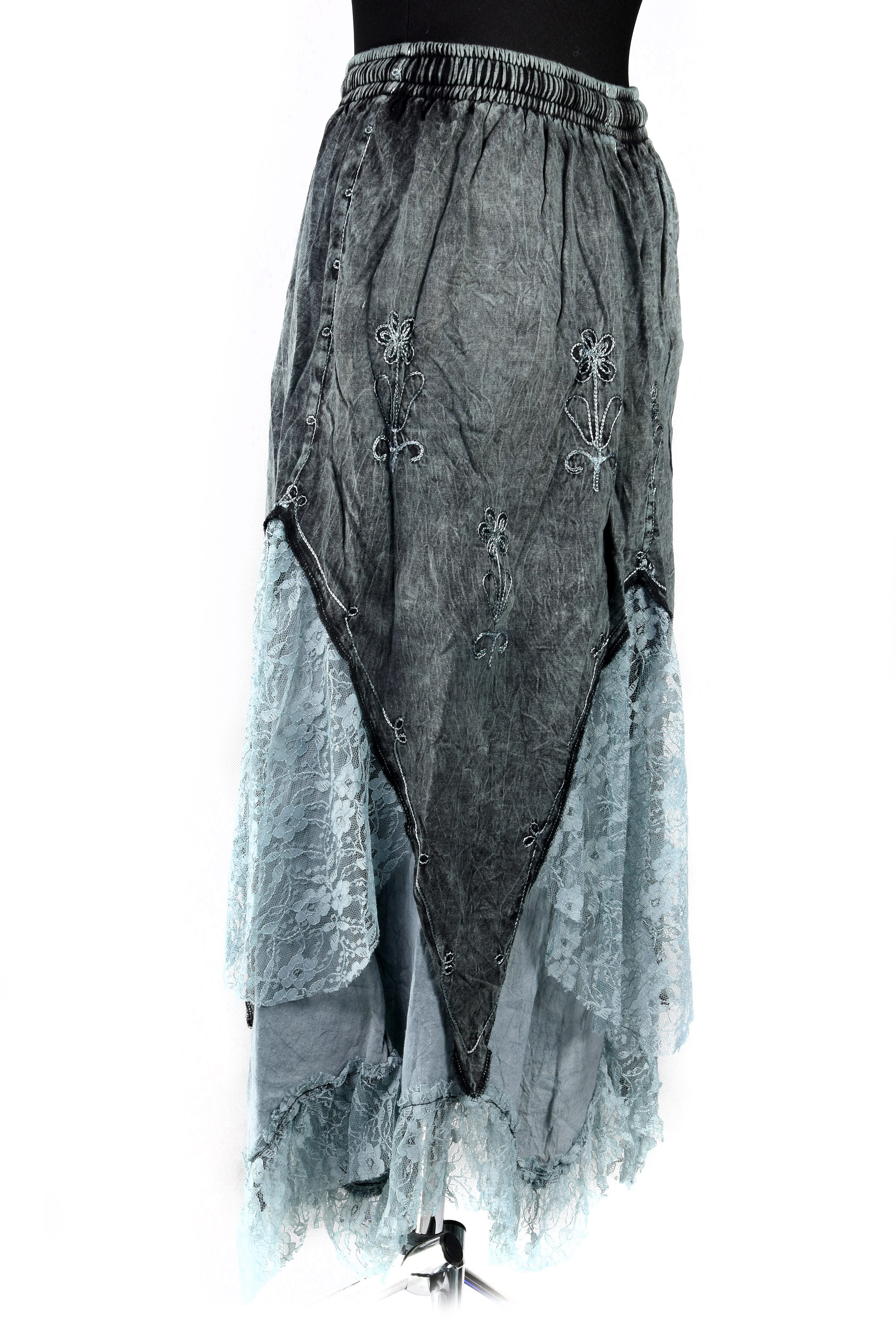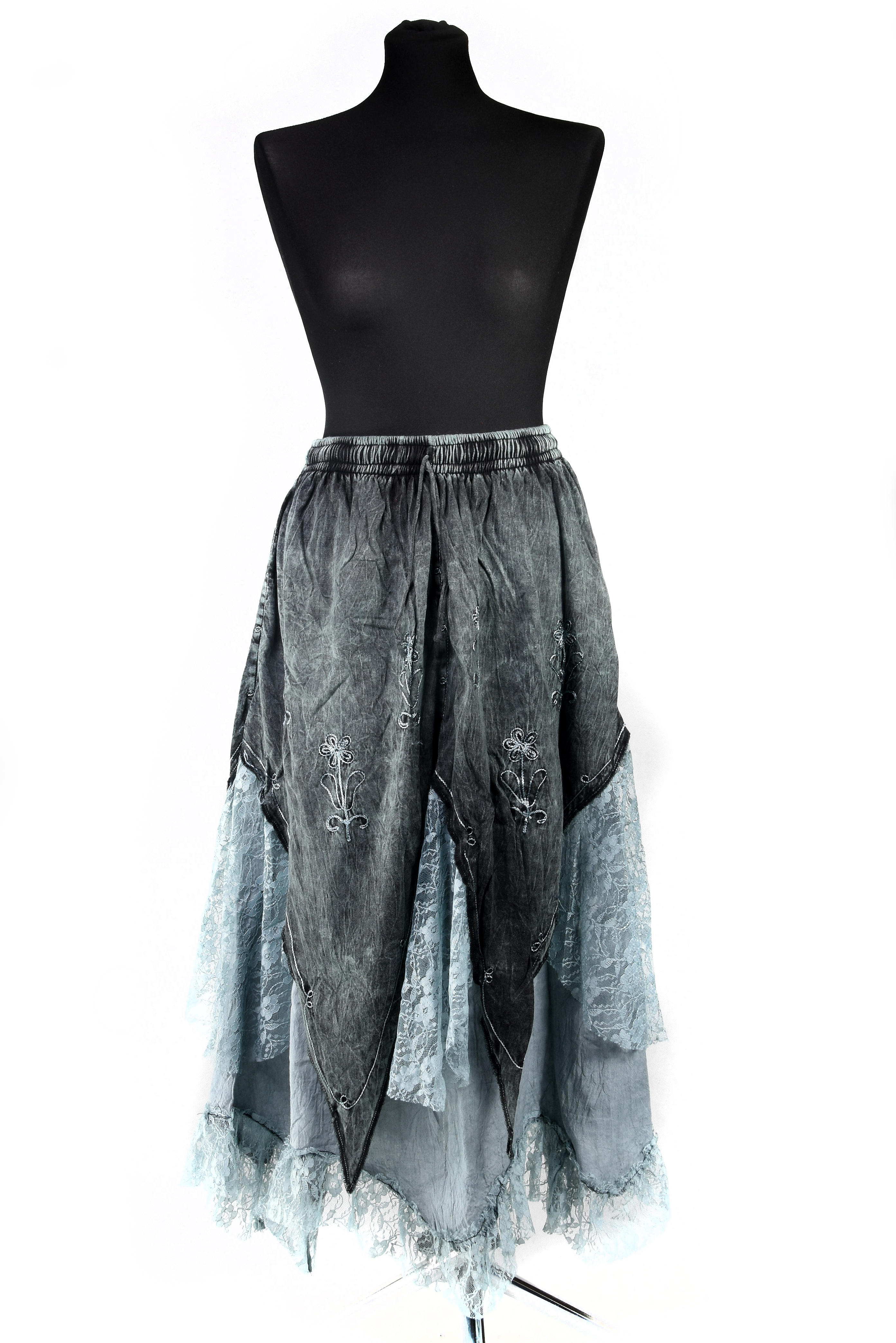 Długa, bawełniana spódnica z Nepalu w stylu boho, o efektownym, asymetrycznym kroju. Górę tworzy jednolity, lekko sprany materiał z dekoracyjnym haftem, a dół wykończony jest warstwą delikatnej, prześwitującej koronki, która nadaje spódnicy lekkości i romantycznego charakteru.