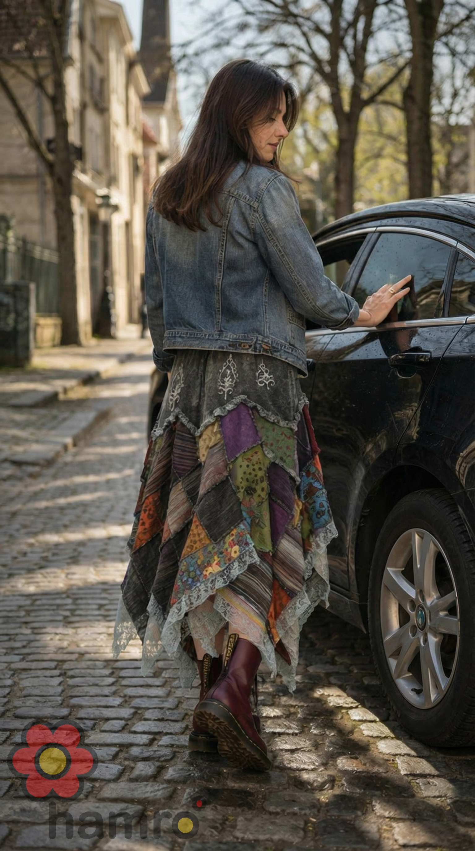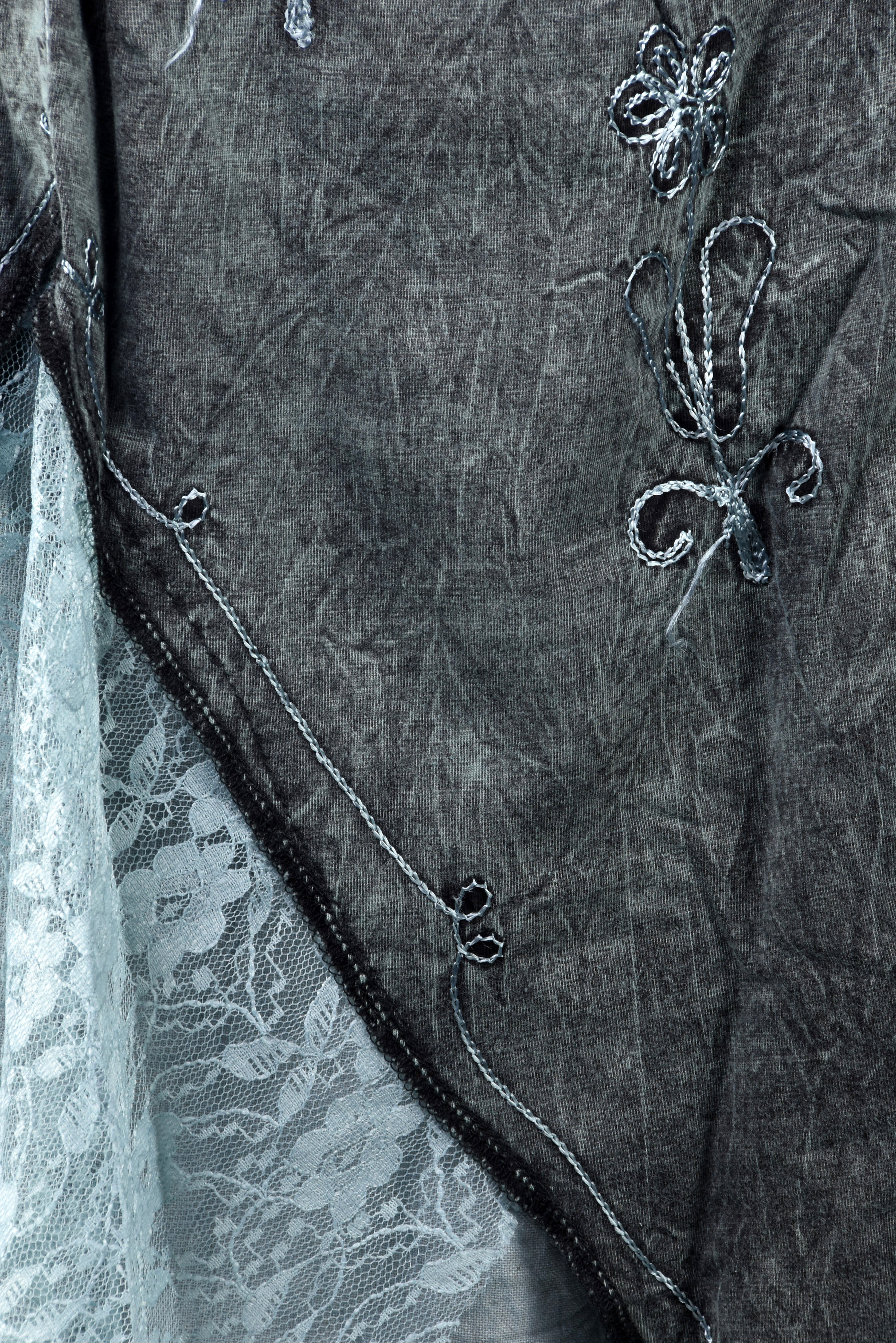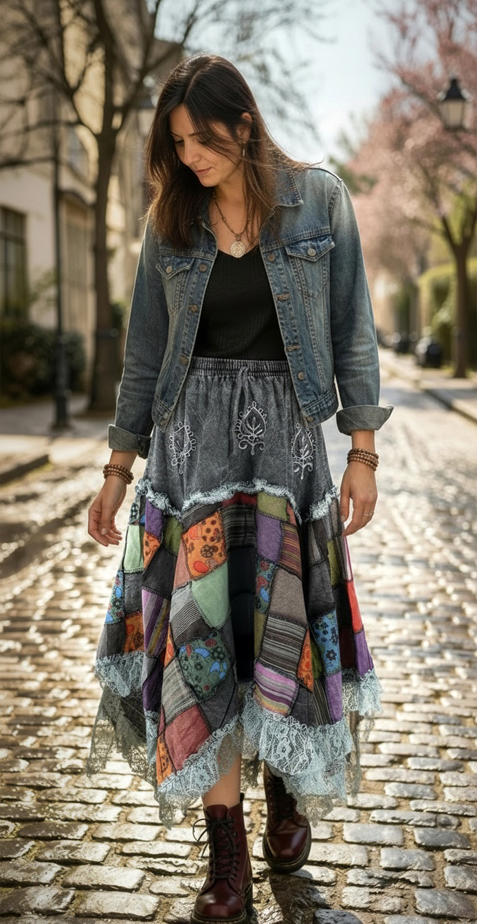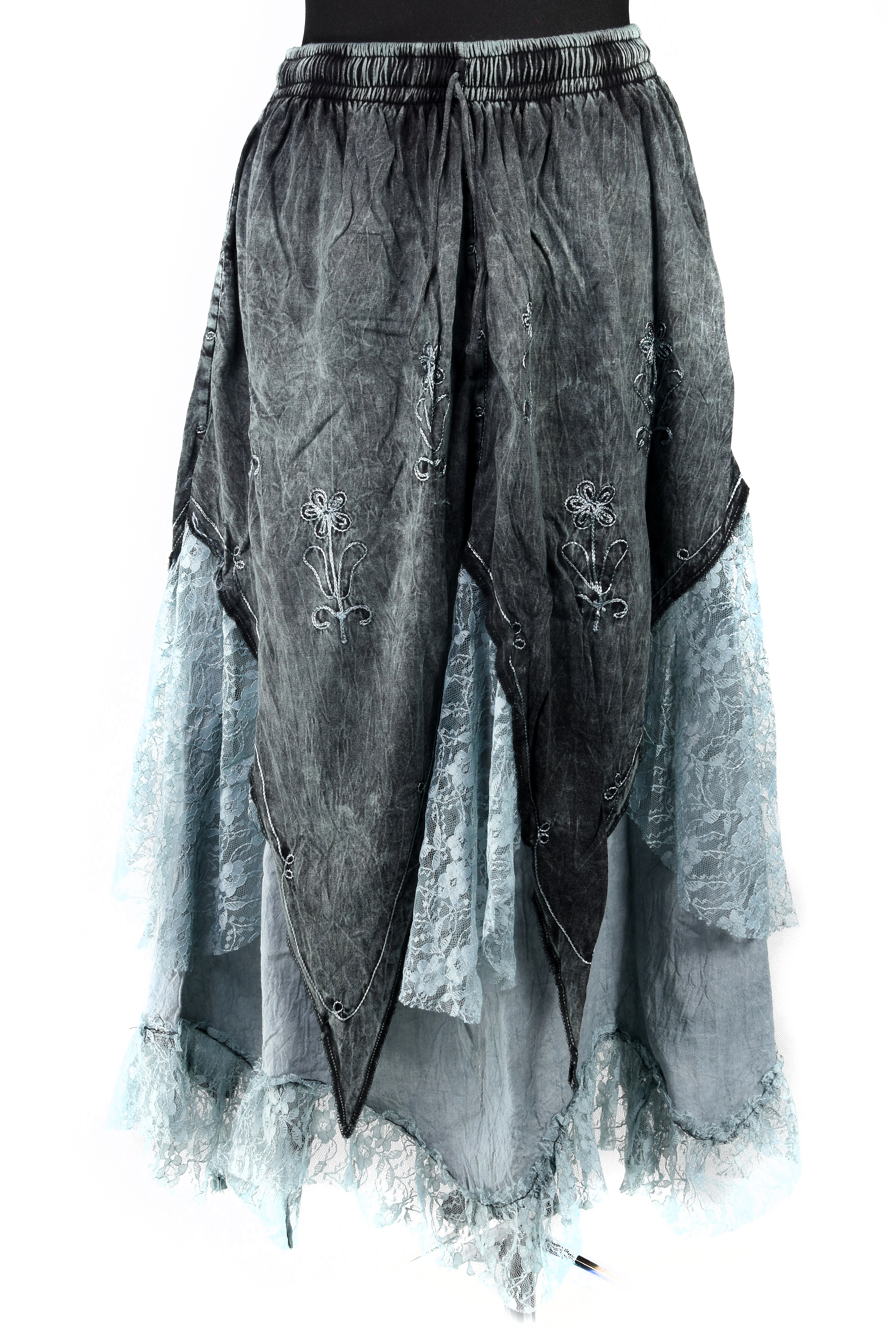 Długa, bawełniana spódnica z Nepalu w stylu boho, o efektownym, asymetrycznym kroju. Górę tworzy jednolity, lekko sprany materiał z dekoracyjnym haftem, a dół wykończony jest warstwą delikatnej, prześwitującej koronki, która nadaje spódnicy lekkości i romantycznego charakteru.