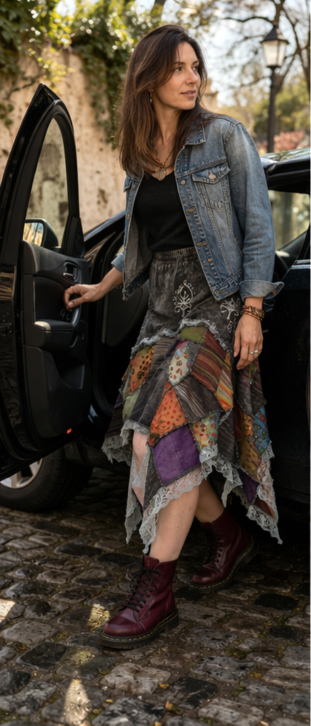 Postarzany (sprany) materiał i subtelne hafty podkreślają etniczny, „gipsy” klimat tej spódnicy. To doskonały wybór dla osób lubiących wygodę, naturalne tkaniny i niebanalny, artystyczny styl.