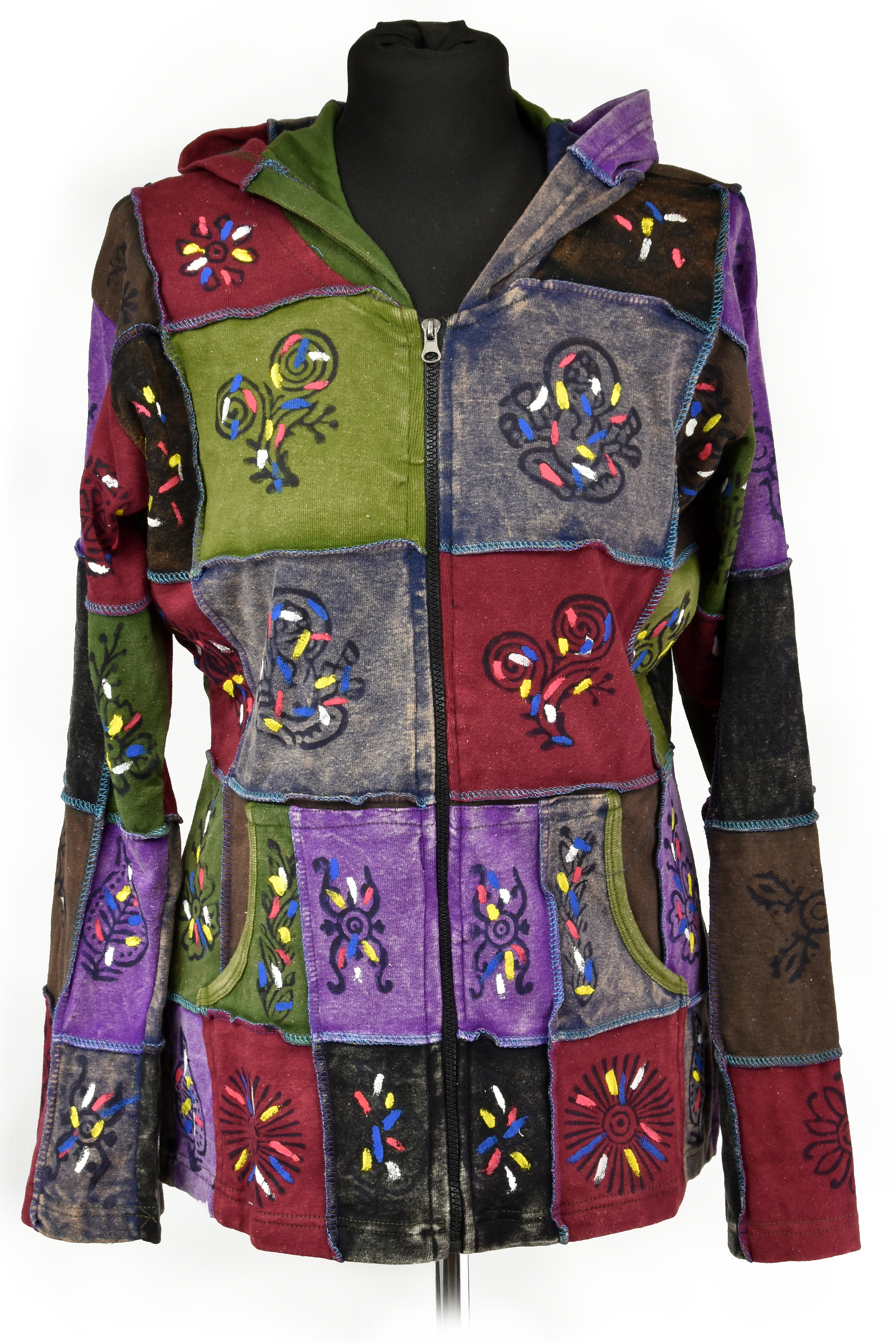 Prezentowana bluza w kolorowym stylu hippie została wykonana w Nepalu. Swój unikatowy charakter zawdzięcza zastosowaniu różnych technik zdobniczych. Bluza jest zszyta z kolorowych kawałków, ozdobionych motywami hinduskimi. Motywy te zostały nadrukowane ręcznie z zastosowaniem metody stempla. Dodatkowo bluza ozdobiona jest delikatnymi pociągnięciami pędzla wykonanymi farbą akrylową do tkanin.